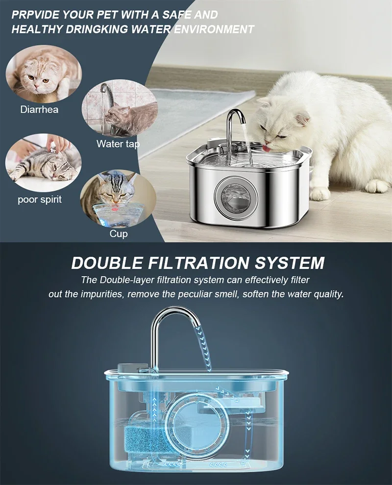 【특징】 1.304 스테인레스 스틸: 고양이 분수는 304 스테인레스 스틸로 만들어져 내구성이 뛰어나고 부식에 강합니다.BPA가 없고 식기세척기 사용이 가능하며 청소가 쉽습니다. 2. 이중 여과 시스템: 활성탄 필터와 프리 필터 스폰지가 장착된 자동 고양이 및 강아지 분수는 애완동물에게 순수한 식수를 제공하고 건강을 유지할 수 있습니다. 3. 대용량 3.2L : 분수대 용량은 2.0L이며, 다중 애완동물 가족에게 적합한 용기에 고수위와 저수위 선이 표시되어 있습니다. 4. 매우 조용함: 1.5W 펌프는 작동 시 매우 조용하며 20db 미만으로 유지됩니다. 귀하와 애완동물의 휴식을 방해할 염려가 없습니다. 5. 식수를 권장하십시오. 역동적인 물 흐름은 애완동물이 물을 마시도록 유도하는 데 도움이 됩니다.식수대 설치 및 분해에는 단 2.5분밖에 걸리지 않습니다.