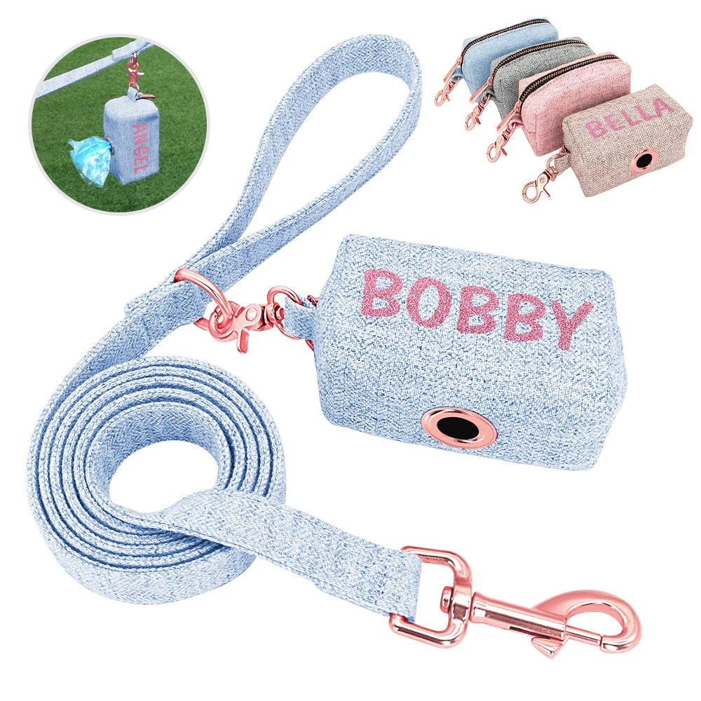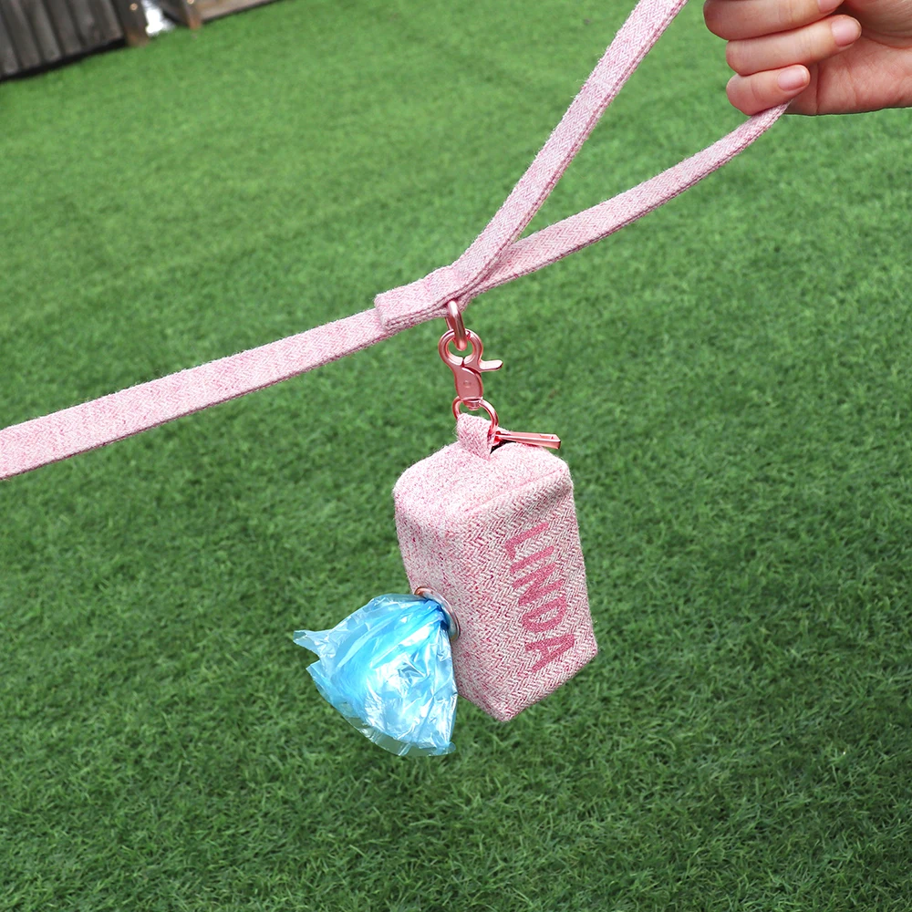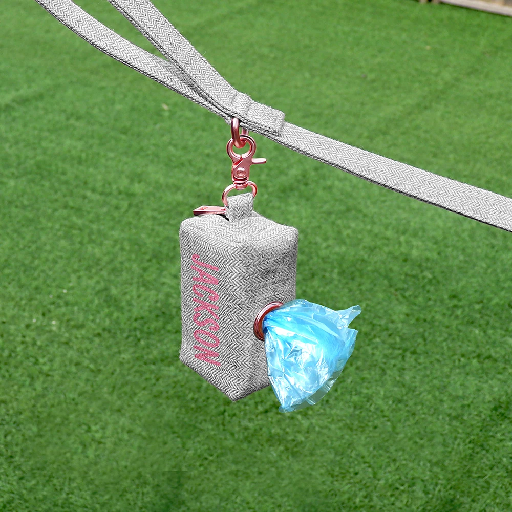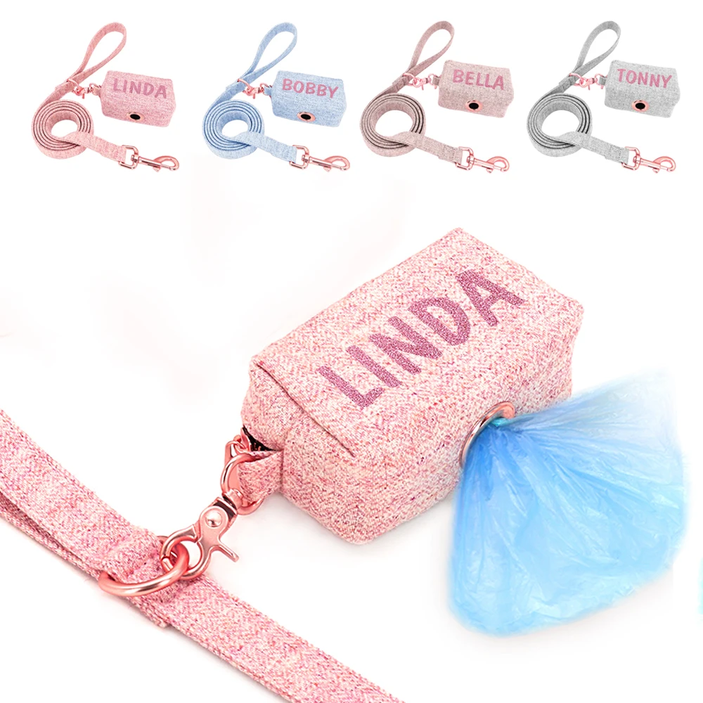 Dispensador de bolsas de residuos de mascotas personalizado, juego de correa portátil para perro, soporte para bolsas de caca de gato personalizado con plomo para caminar, nombre grabado