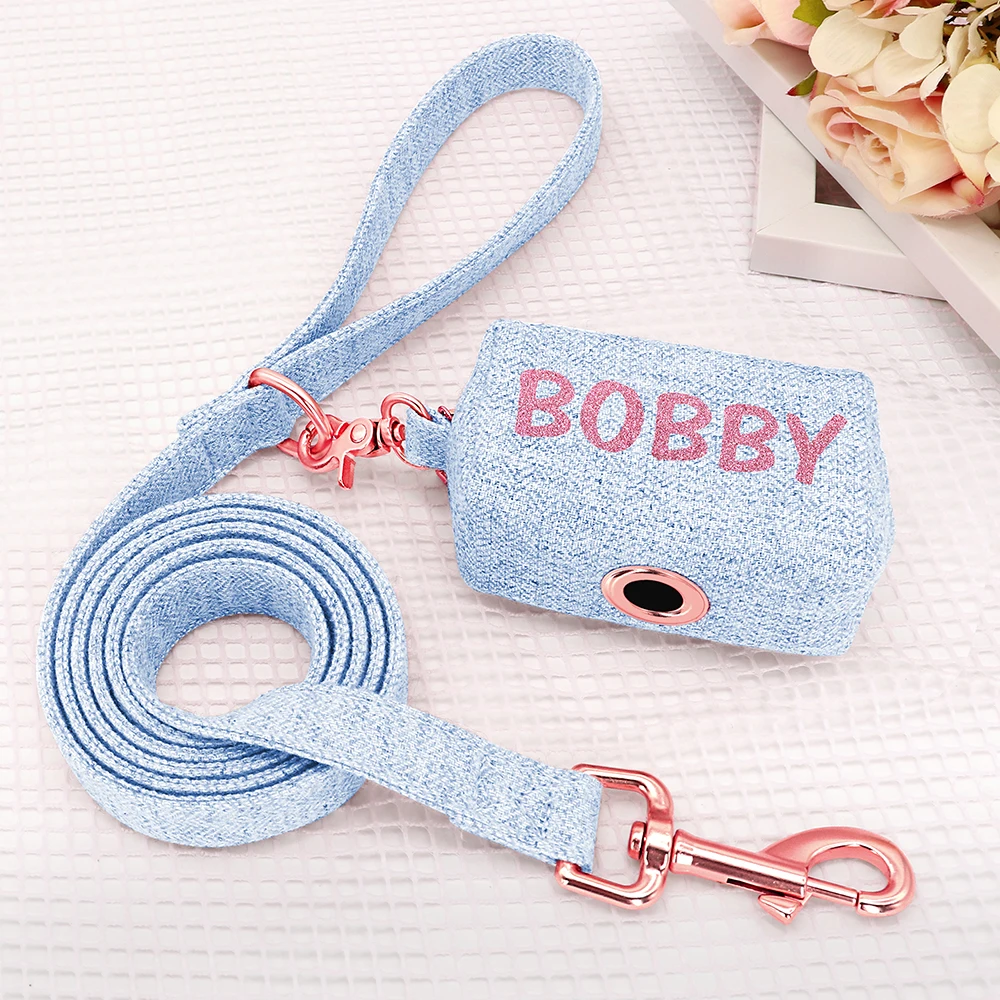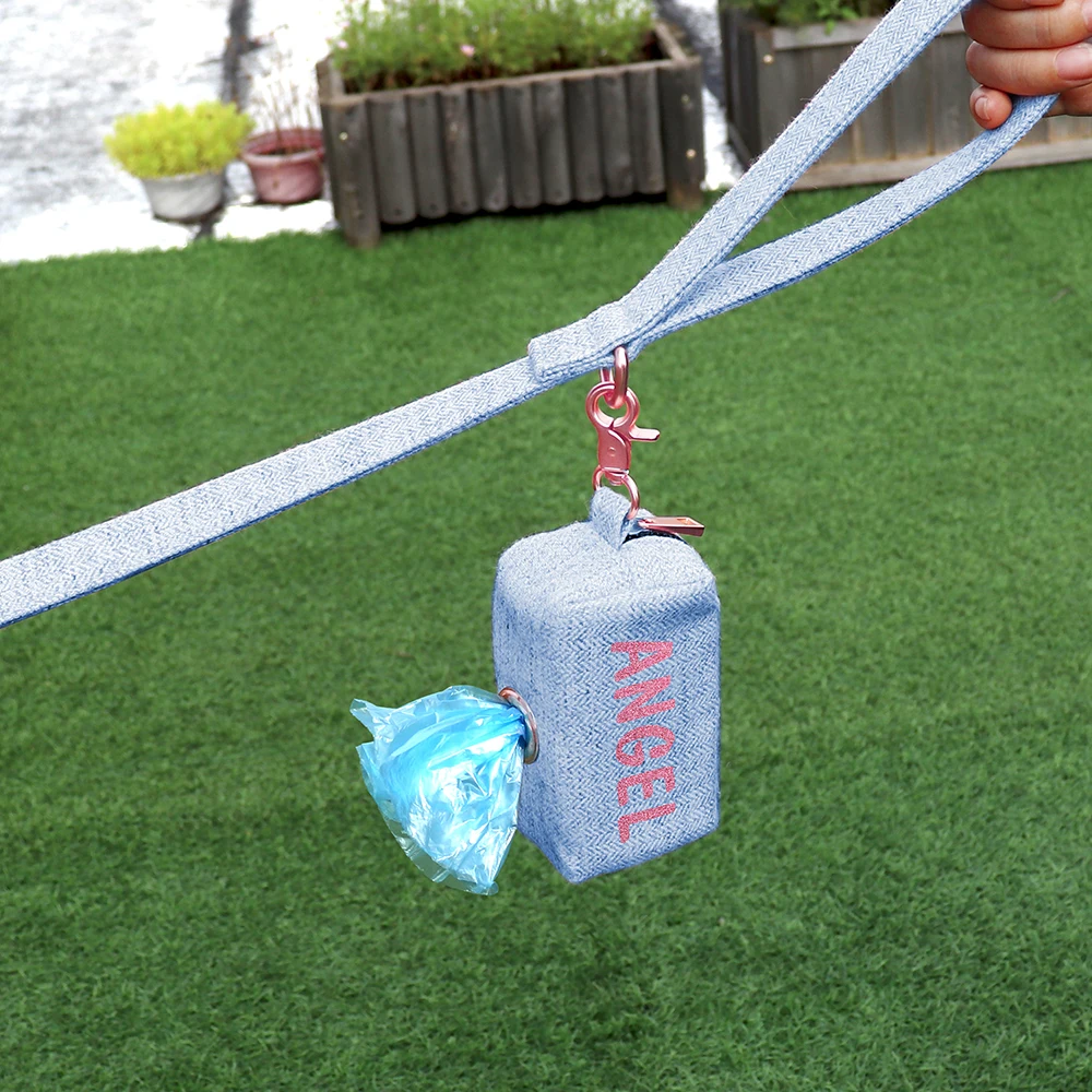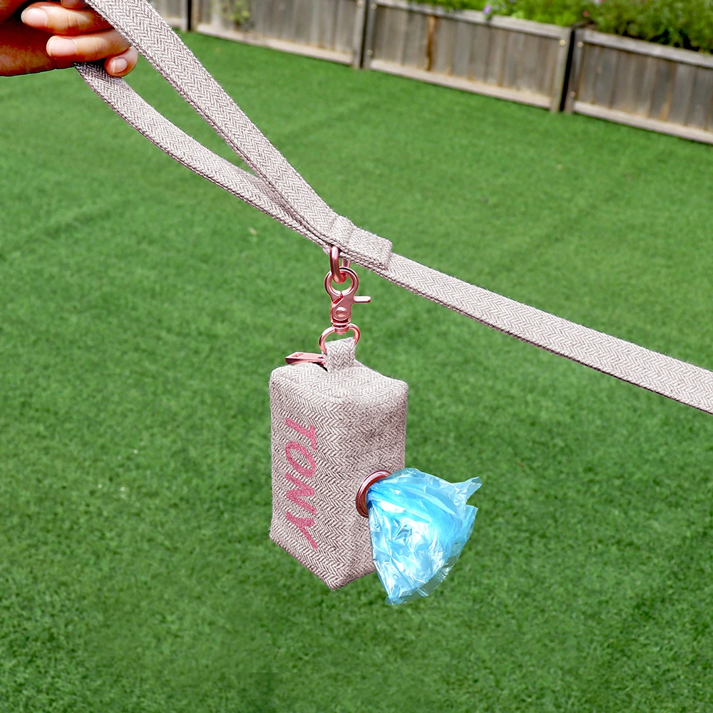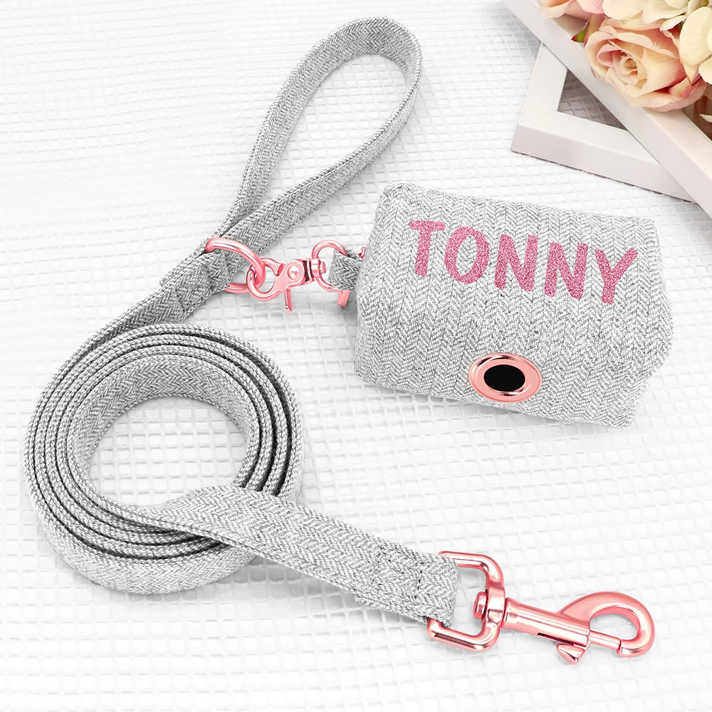 Dispensador de bolsas de residuos de mascotas personalizado, juego de correa portátil para perro, soporte para bolsas de caca de gato personalizado con plomo para caminar, nombre grabado