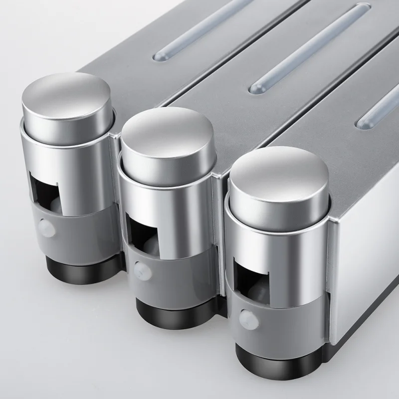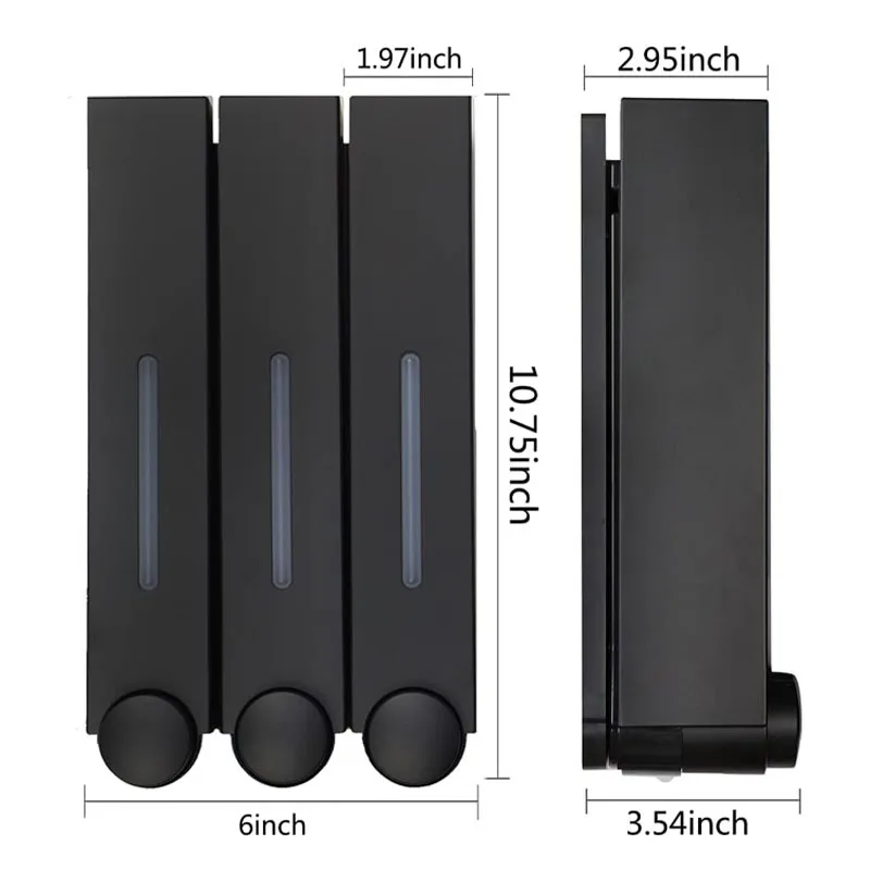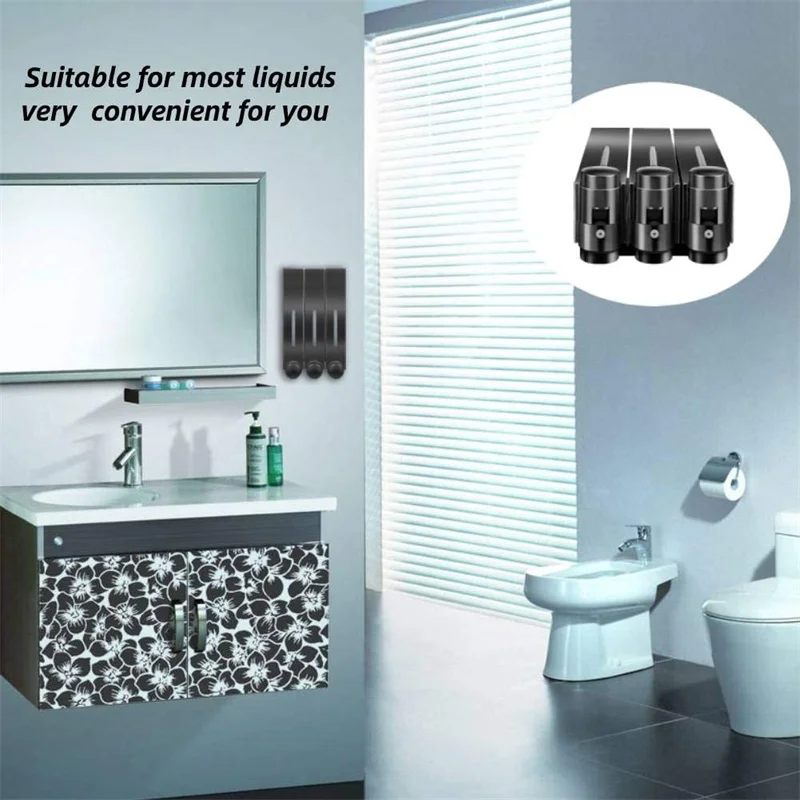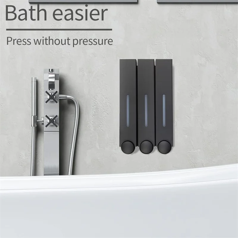 Aplicación: Dispensador de champú para ducha de 3 habitaciones, ideal para baño, hotel, gimnasio, club, hogar y otros lugares.Nota: Los dispensadores de champú y acondicionador en la pared de la ducha no son adecuados para acondicionadores espesos, champús, etc., o puede diluirlos agregando agua primero.