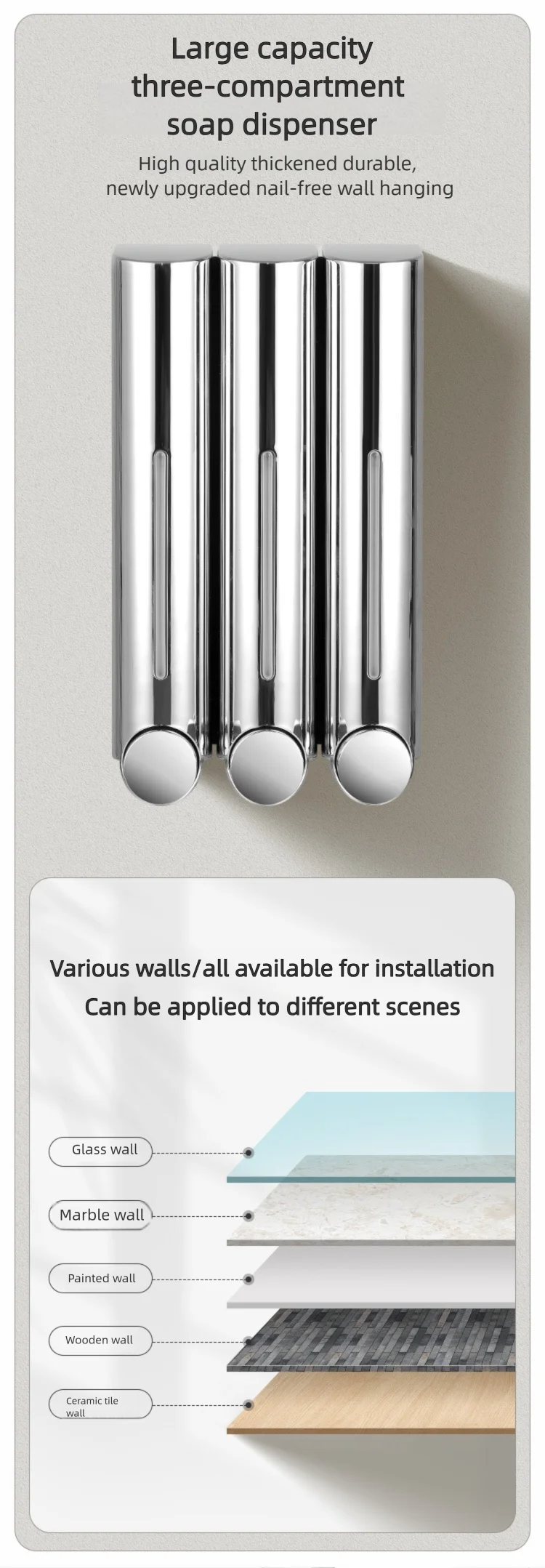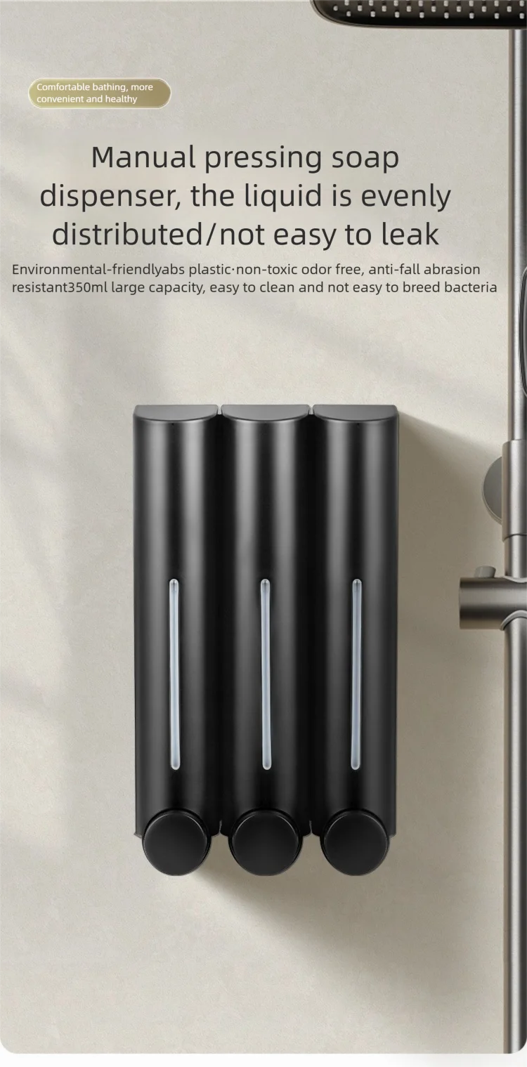 Plástico ABS ecológico: el dispensador de jabón para baño con 3 compartimentos montado en la pared es resistente y duradero.Resistente al calor, no es fácil de deformar, sin bacterias, anticorrosión, saludable e higiénico.