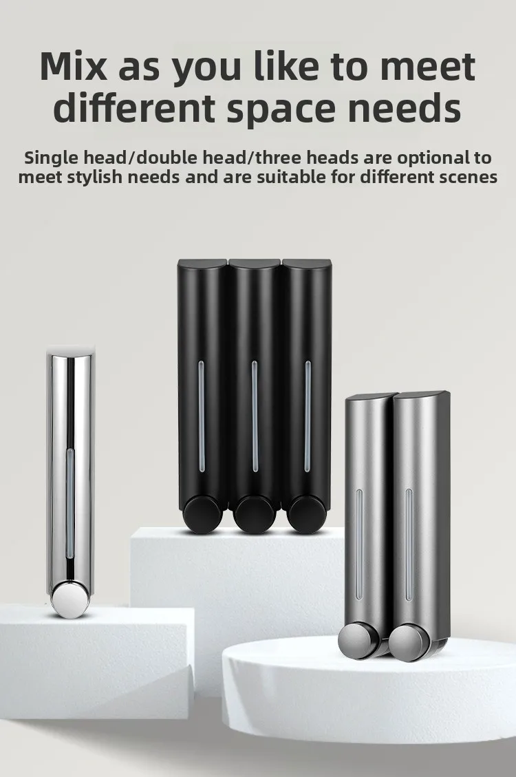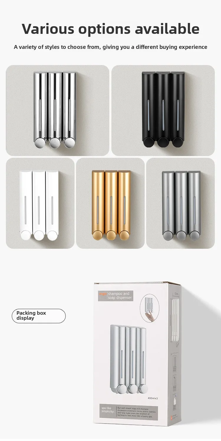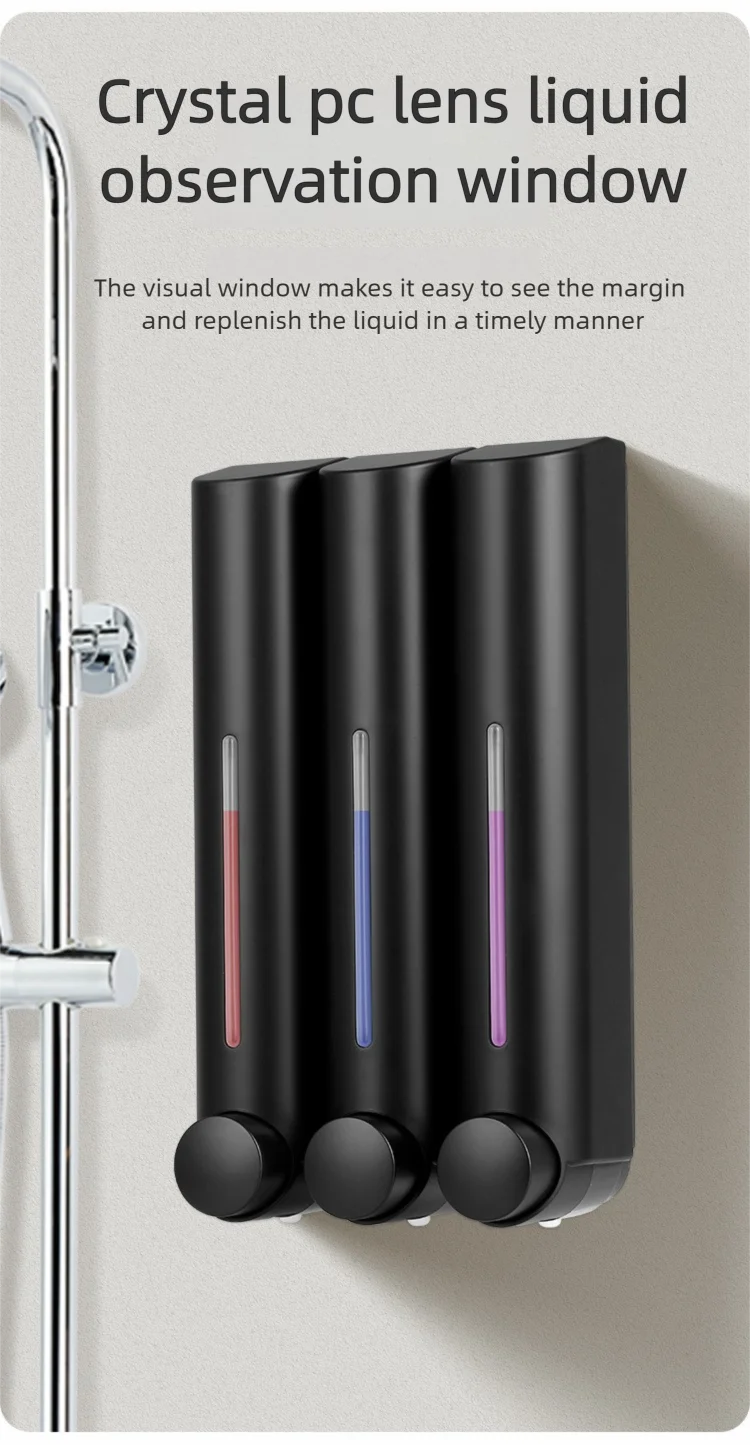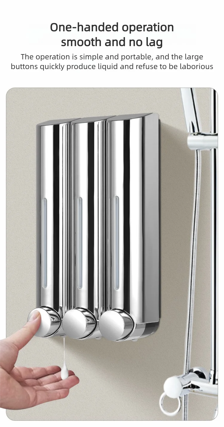 Aplicación: Dispensador de champú para ducha de 3 habitaciones, ideal para baño, hotel, gimnasio, club, hogar y otros lugares.Nota: Los dispensadores de champú y acondicionador en la pared de la ducha no son adecuados para acondicionadores espesos, champús, etc., o puede diluirlos agregando agua primero.
