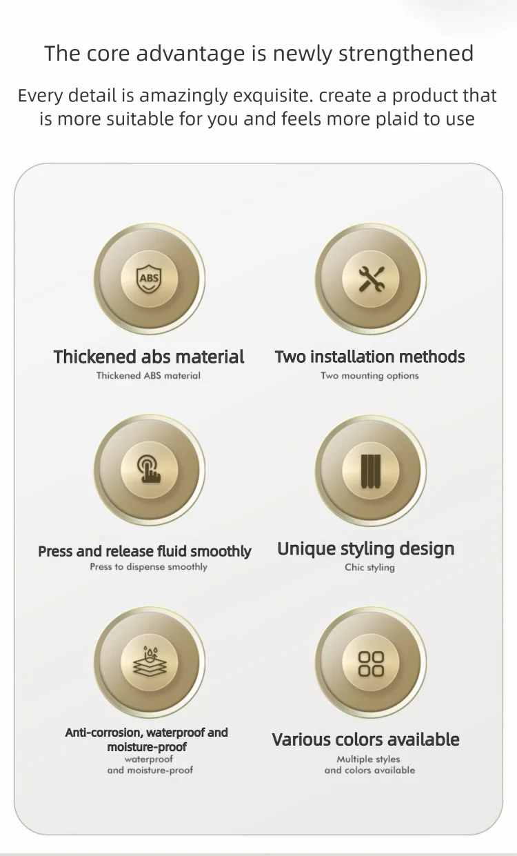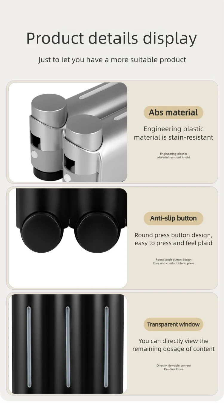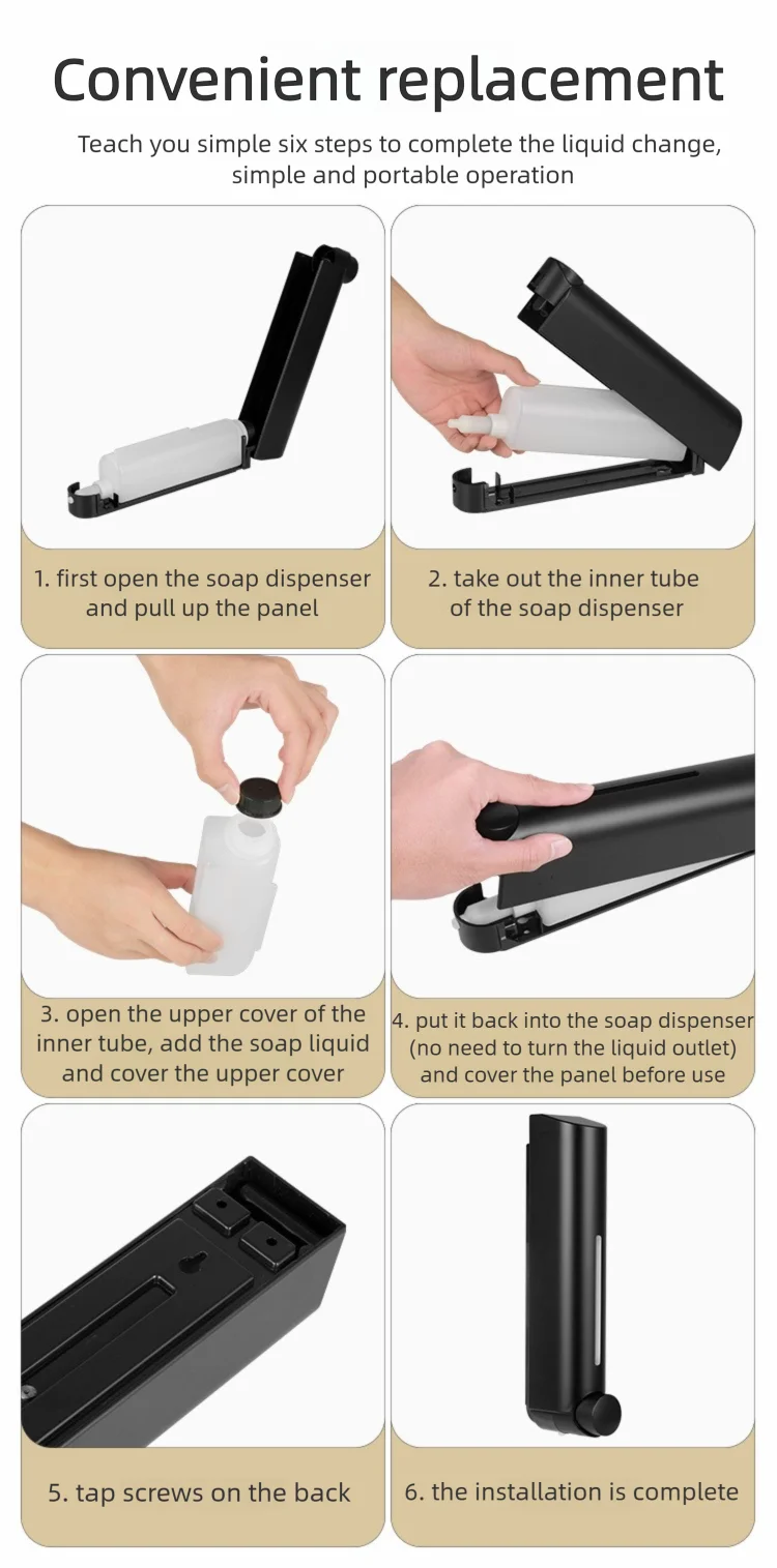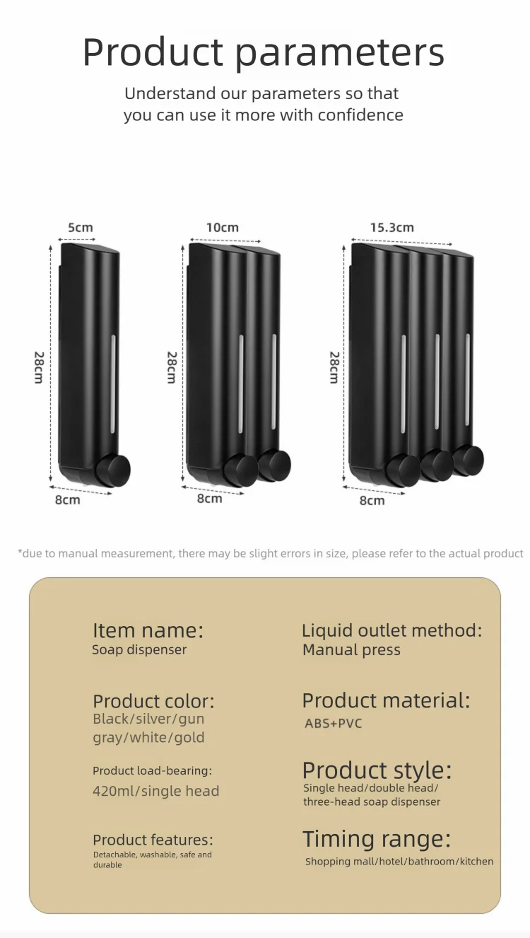 Diseño sin perforaciones montado en la pared: fácil de instalar y usar.Boquillas de alta calidad para evitar fugas y desperdicios.El dispensador de jabón para pared interior es una botella recargable y extraíble.La capacidad de cada habitación es de 420 ml.