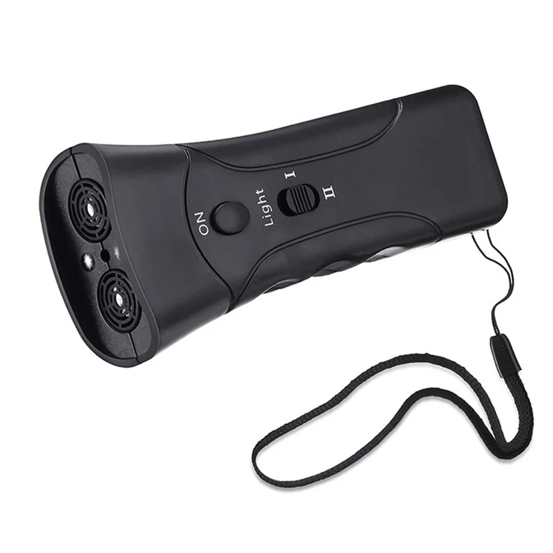 El entrenador se basa en la teoría de que el ultrasonido (la onda ultrasónica alcanza hasta 125dB) está por encima del límite superior del oído humano y la luz blanca súper ultrasónica y 28000MCD fuerte. Puede activar la activación visual y aditiva en perros, gatos y otros animales, pero no habrá efectos en las personas. Hay tres modos de uso: entrenamiento, perro, Banish dog, iluminando.