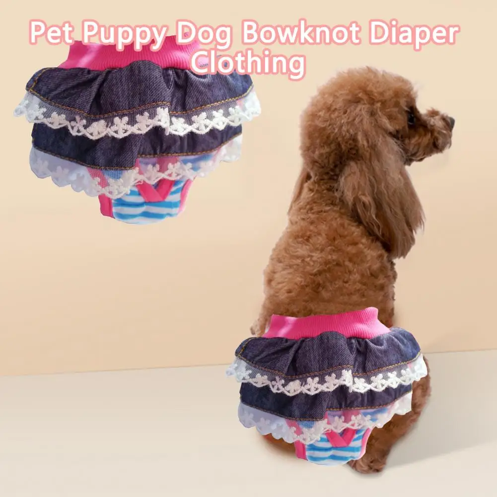 El pañal para mascotas está decorado con costuras y lazos de encaje, y impreso con estrellas o rayas, con colores brillantes y mano de obra exquisita.Tiene agujeros en la cola, por lo que no ata la cola de la mascota.