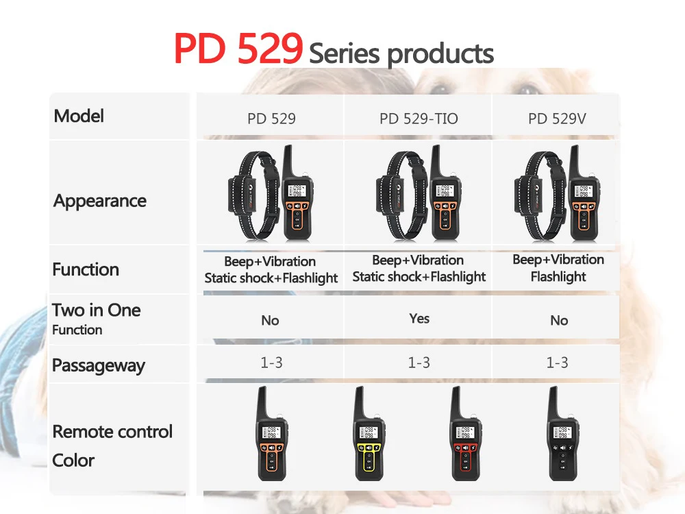 Descripción del productoModeloPD 529V-1RecargableSIResistente al aguaSÍ, IP67Funciónpitido+vibración+linternaVentajaControl remoto de 1000 metros, 100 niveles ajustables, el mejor vendedor de AmazonAhorro de energíaSí, súper ahorro de energía, cuando se carga 2 horas, podría funcionar 60 díasCollarCollar de nailon reflectante negro ajustable.Composición de la bateríaPolímero de litioCertificación del productoCE, ROHS, FCCOEMAceptar