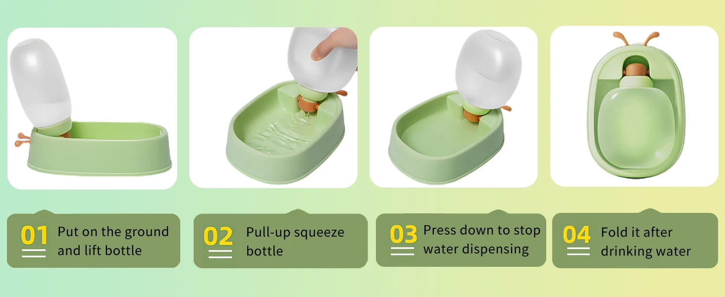 💦A prueba de fugas: al alimentar a su perro, levante la parte superior de la botella para apretarla y el agua saldrá, y cuando haya terminado de beber, presione la parte superior de la botella para bloquearla en su lugar y evitar derrames.