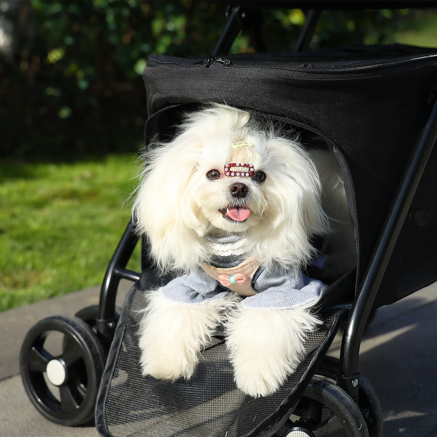 Rueda delantera 360° Rotación y freno de la rueda trasera: la rueda delantera se puede girar 360°, facilitando el cambio de dirección.La rueda trasera tiene un freno, por lo que puedes detener fácilmente el carrito de la mascota presionándolo hacia abajo con los pies e incluso en pistas.