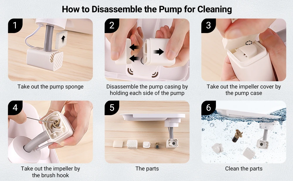La limpieza regular de la bomba reducirá el crecimiento de bacterias y evitará que el cabello se obstruya en el rotor y evite que la fuente funcione debido a la obstrucción.