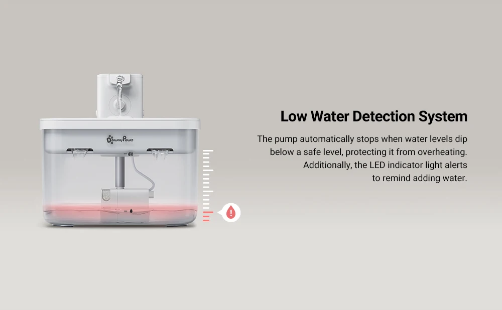 La bomba puede detectar de forma inteligente el nivel mínimo de agua para evitar continuar funcionando en caso de escasez de agua, lo que mejorará en gran medida su vida útil. Al mismo tiempo, la luz roja también es más fácil de recordar que necesita rellenar la fuente con agua.