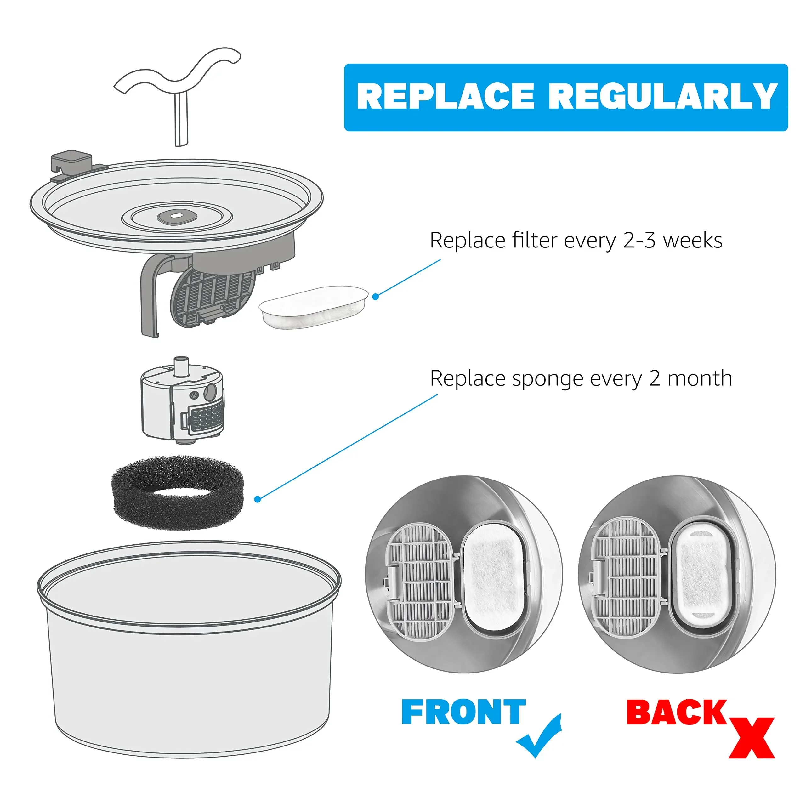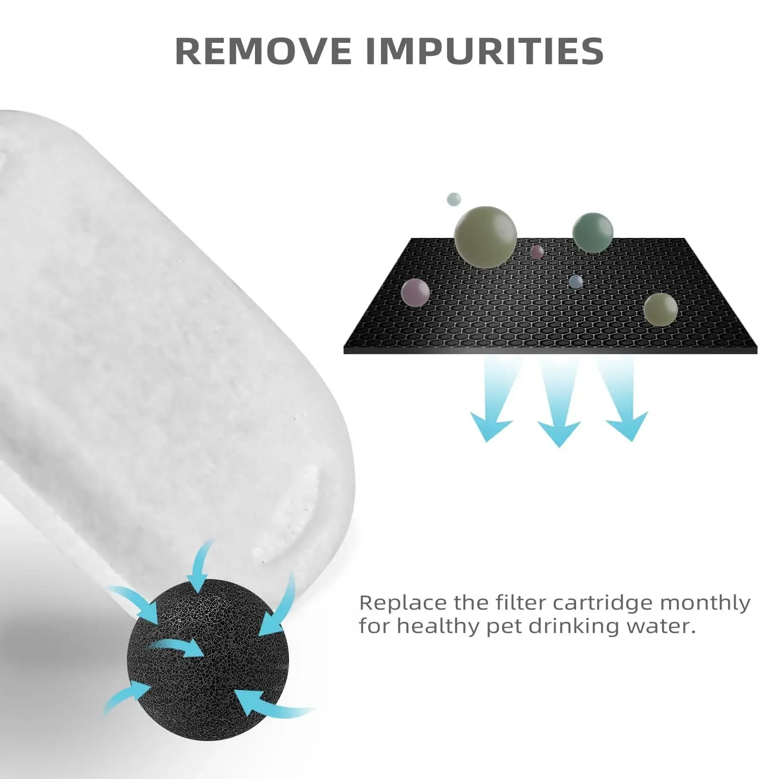 Sugerencias de uso: Para mantener el agua potable fresca e higiénica, se recomienda reemplazar los filtros de la fuente de agua para mascotas cada 2-4 semanas, dependiendo de la cantidad de gatos en su hogar. Antes de reemplazar el filtro de la fuente para mascotas, enjuáguelos bien con agua corriente y luego instálelos en la fuente para gatos.