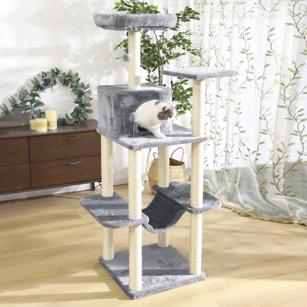 Los gatos pueden acostarse en la hamaca en el nivel superior.