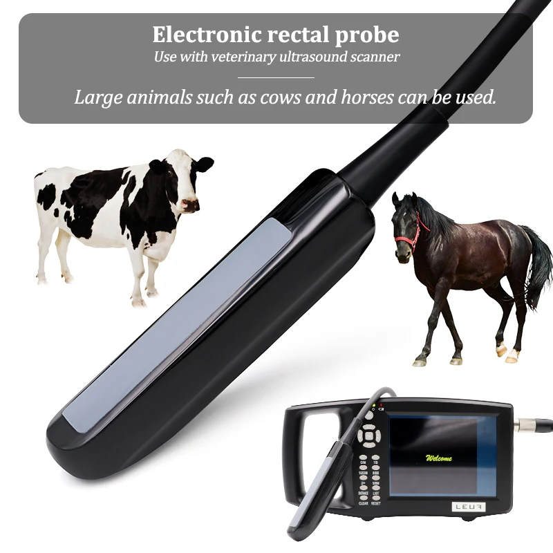Características de la máquina de ultrasonido veterinario1. Esta máquina se puede equipar con dos tipos de sondas, una es la sonda convexa CXA50R/3,5 MHz adecuada para cerdos y ovejas. La otra es la sonda rectal lineal LNA64/6,5 MHz adecuada para ganado caballo camello.