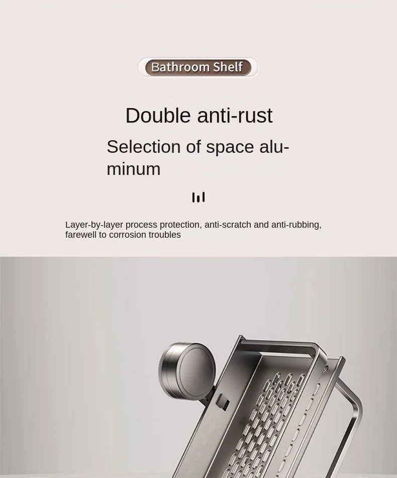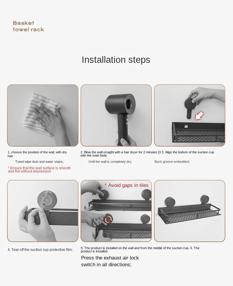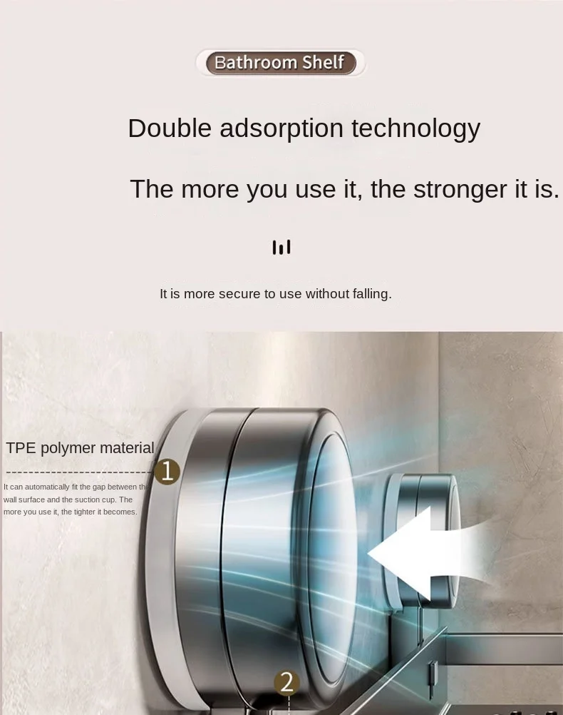 2.Estante de almacenamiento de ducha desmontable con ventosa fuerte: el estante de almacenamiento de ducha desmontable se puede instalar y quitar fácilmente de la pared lisa con solo presionar la ventosa, lo que lo hace rápido y cómodo de usar.