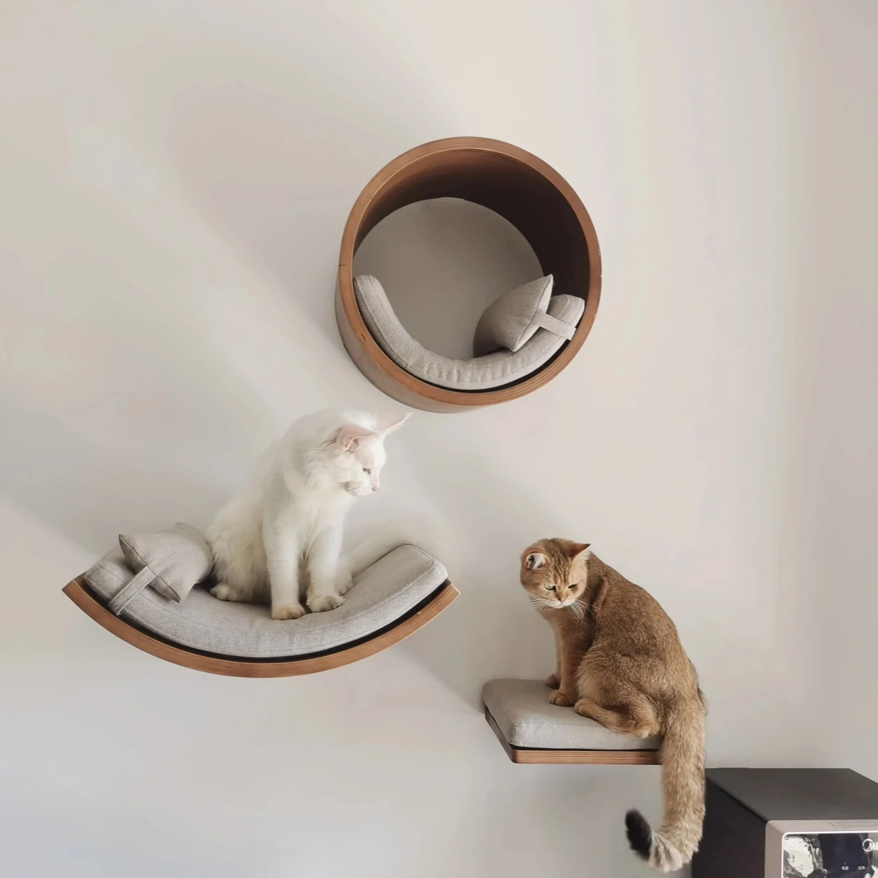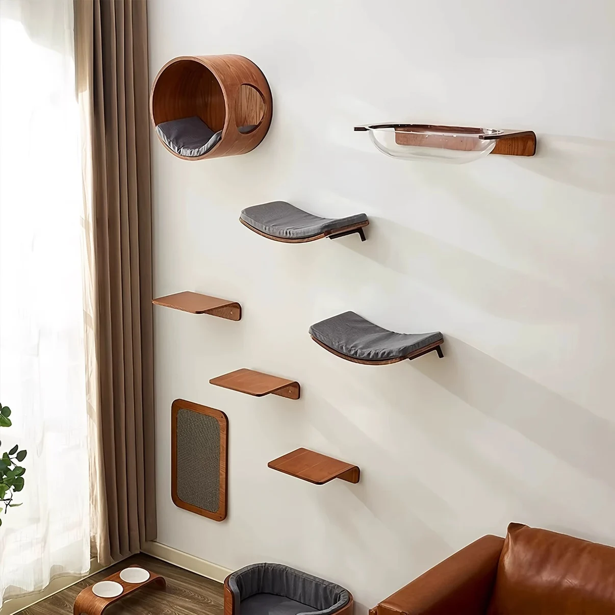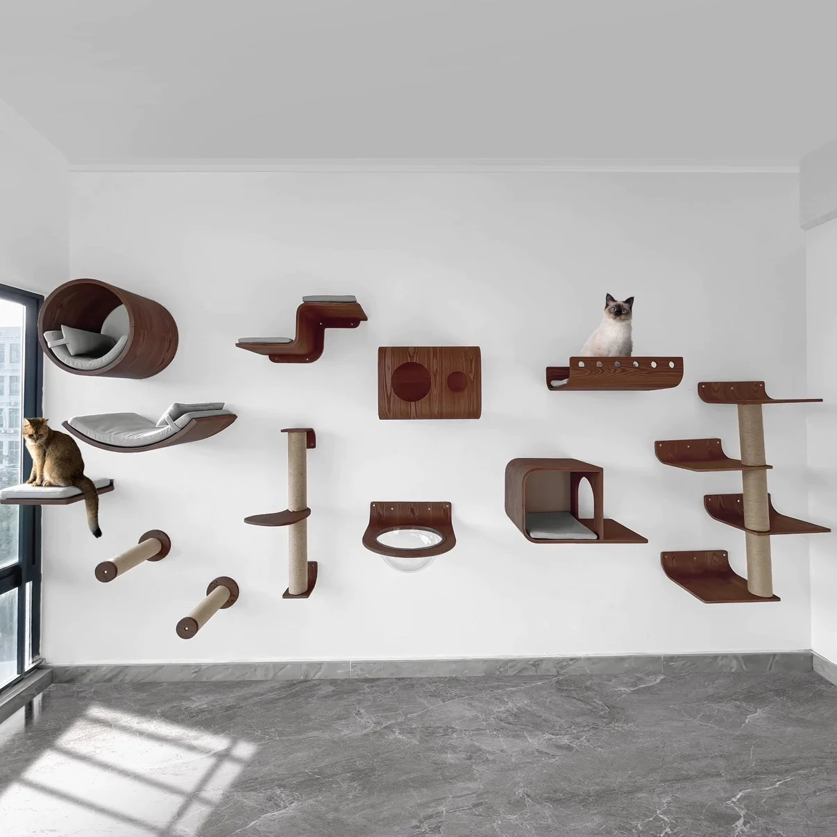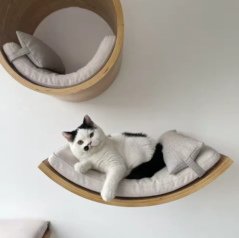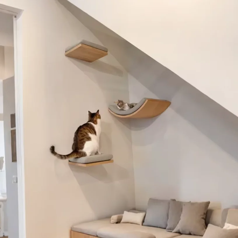 Una solución de espacio vertical ideal para casas pequeñas, que combina un rascador de sisal, una hamaca y una plataforma de escalada para satisfacer los instintos naturales de su gato para rascarse, saltar y descansar, permitiendo a su amigo felino reclamar su propio territorio en la pared.