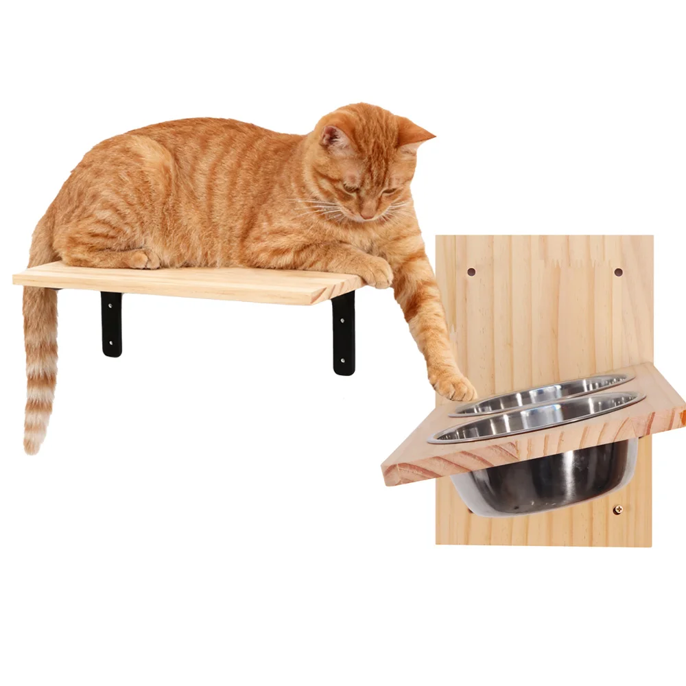 Estante de madera para gatos montado en la pared con tazones dobles de acero inoxidable para comida y agua, muebles para gatos para comer y descansar
