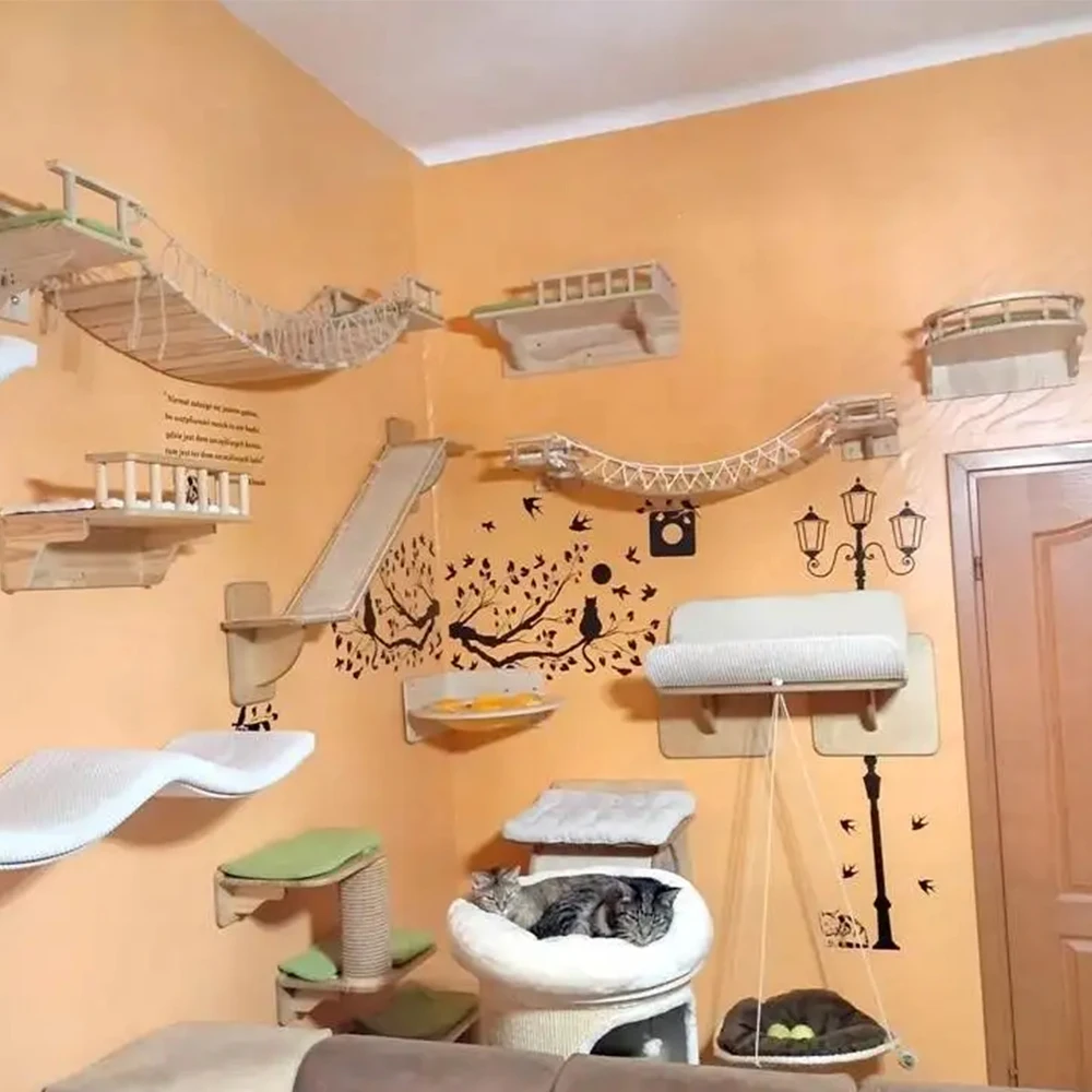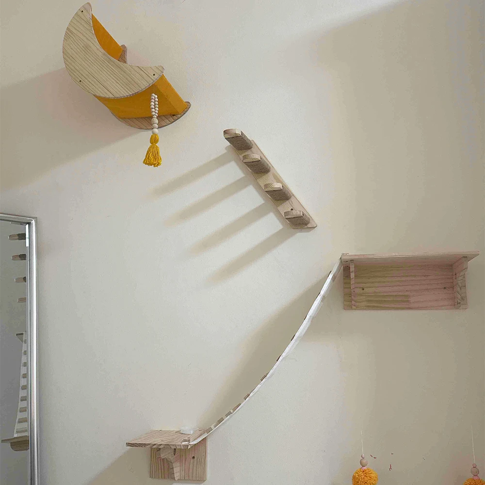 Los estantes de pared para gatos se adaptan al hábito de los gatos de escalar, aumentan el ejercicio y reduciendo la posibilidad de obesidad, lo que es bueno para la salud. Además, le da a los gatos espacio para escalar y evitar estropear la casa.