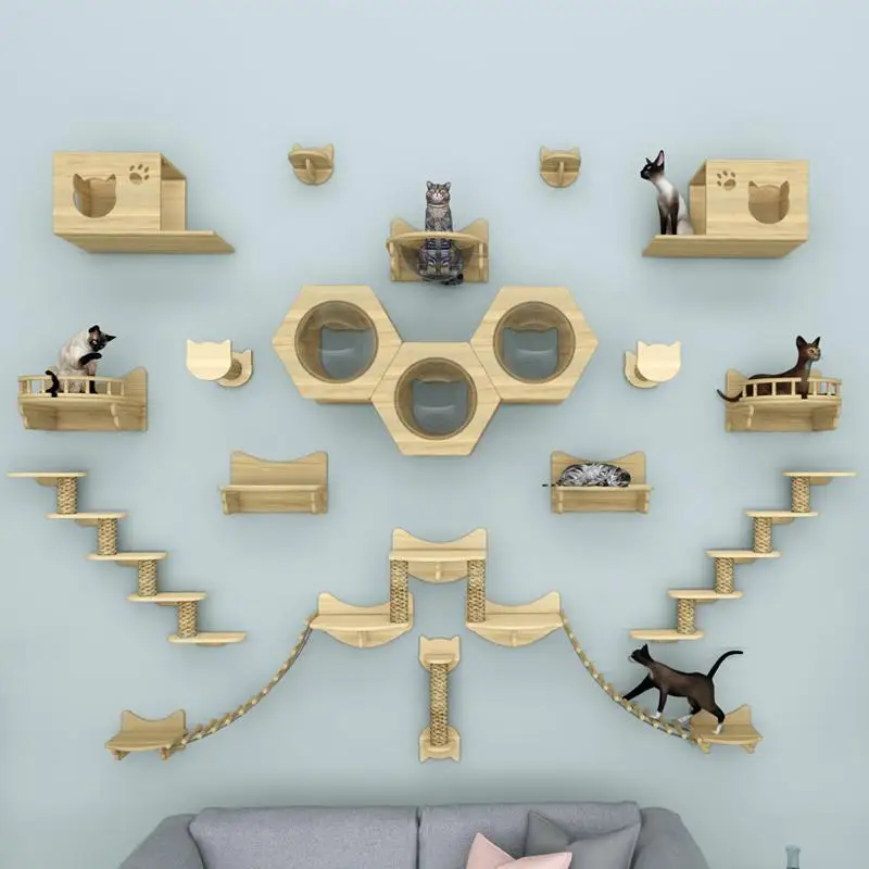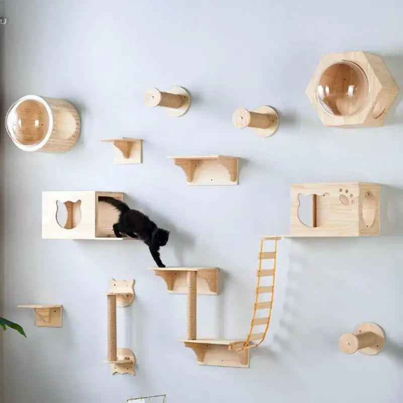El estante de escalada para gatos se monta en la pared y se puede instalar en esquinas y paredes, sin ocupar espacio en el suelo. En una familia con área limitada, proporciona un espacio vertical al que a los gatos les gusta escalar, jugar, descansar, dormir, agarrar la tabla y otras necesidades, lo que reduce el impacto en su vida diaria.
