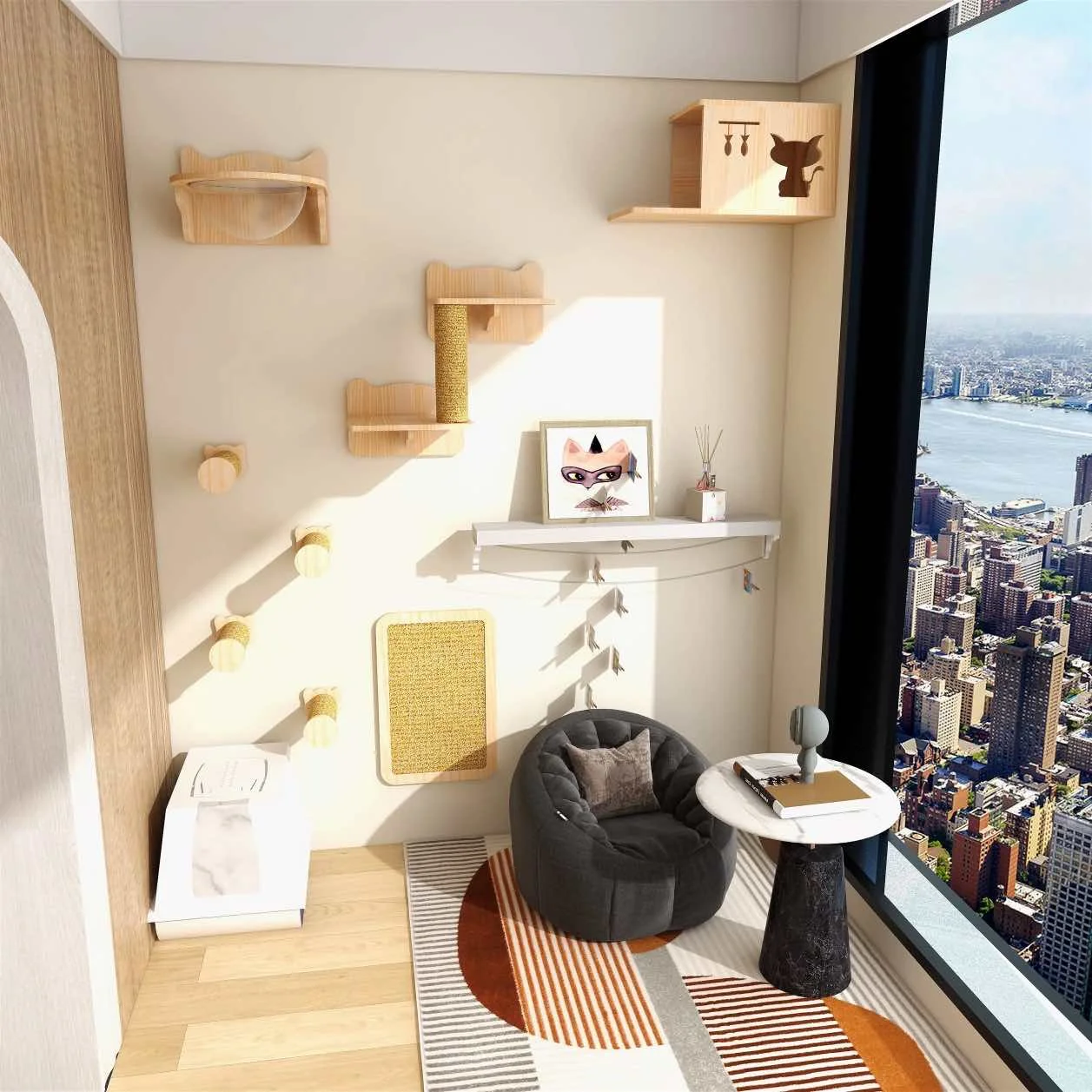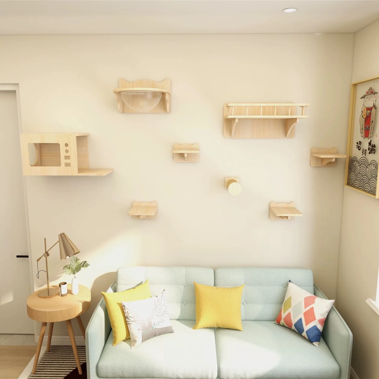 Los estantes de pared para gatos se adaptan al hábito de los gatos de escalar, aumentan el ejercicio y reduciendo la posibilidad de obesidad, lo que es bueno para la salud.Además, le da a los gatos espacio para escalar y evitar estropear la casa.
