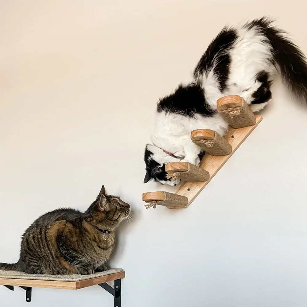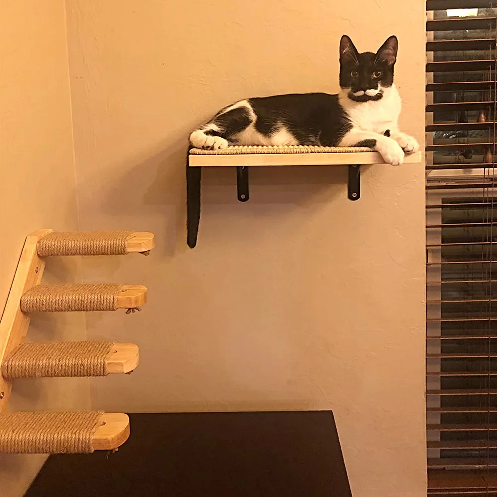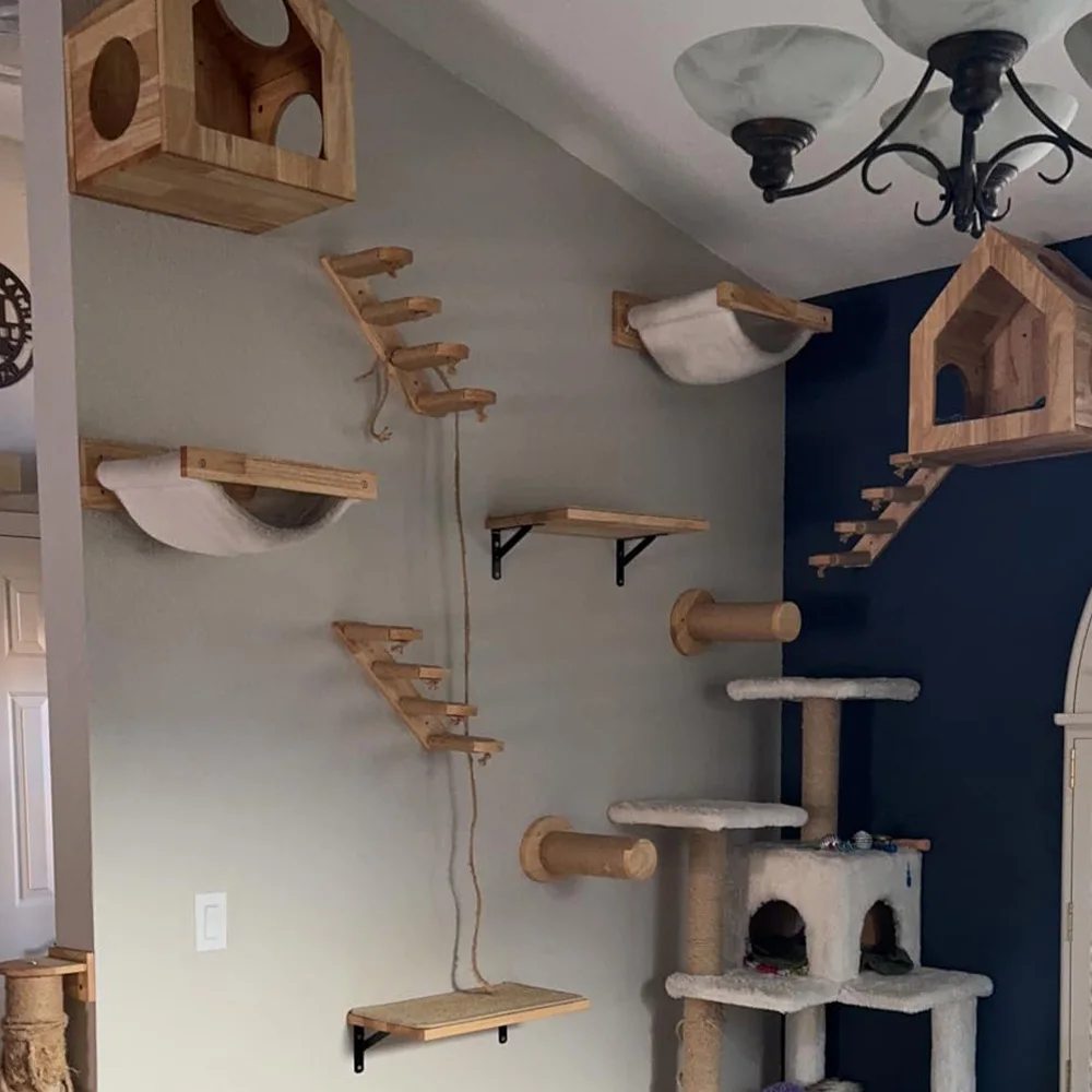 Los estantes de pared para gatos se adaptan al hábito de los gatos de escalar, aumentan el ejercicio y reduciendo la posibilidad de obesidad, lo que es bueno para la salud.Además, le da a los gatos espacio para escalar y evitar estropear la casa.