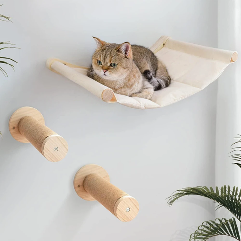 Cat Wall Shelves with Hammock & Steps Mounted Perch and Bed for Kittens Cat Climbing Shelves Solid Wood Furniture Indoor Use