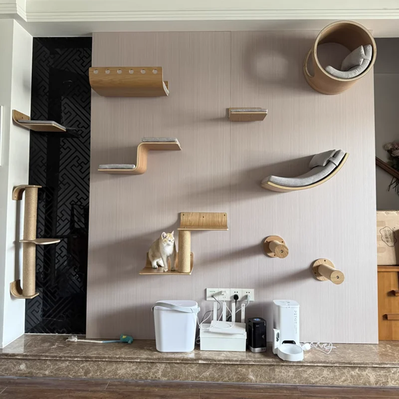 Se pueden combinar e instalar de manera flexible según el espacio de la pared, el diseño del hogar y los hábitos de actividad del gato. Ya sea una unidad pequeña compacta o un espacio grande y espacioso, se puede planificar inteligentemente para aprovechar al máximo el espacio vertical y crear un parque de atracciones exclusivo para gatos único, sin ocupar demasiado espacio en el suelo y mantener limpio el hogar.