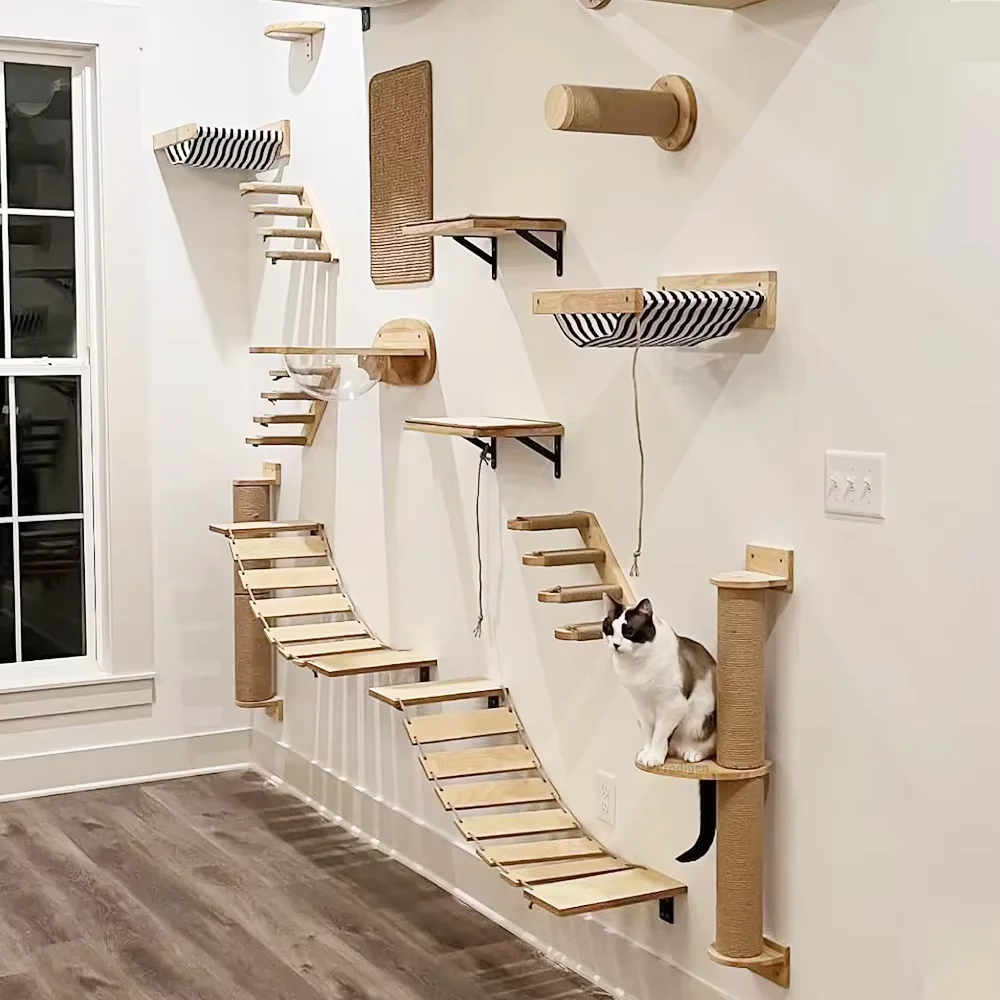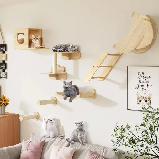 Cuenta con un marco de color madera natural con un diseño minimalista que se integra perfectamente en varios estilos de decoración del hogar.El diseño liviano permite una instalación en la pared sin ocupar espacio en el piso, brindando a los gatos amplias áreas de juego y agregando un toque único a la decoración de su hogar.