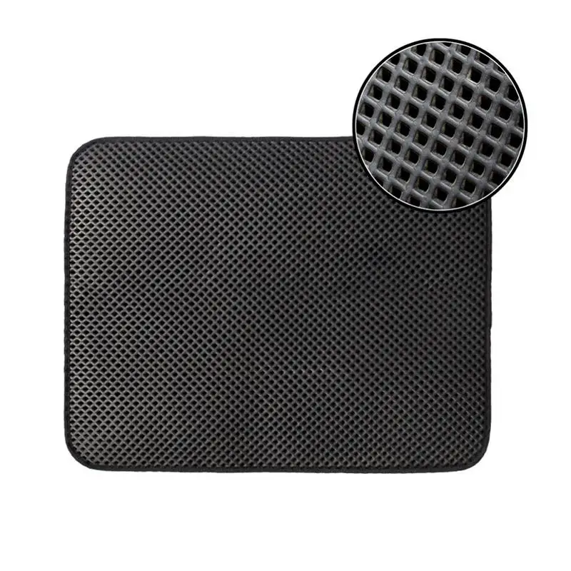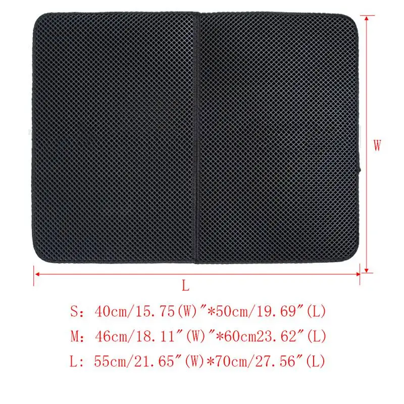 Características:. 100% nuevo y de alta calidad.... Hecho de EVA de alta calidad y tela sólida y duradera.... La alfombra con diseño de malla superior puede recoger la arena para gatos de manera efectiva, evitando que Manche el suelo.... La estructura en forma de bolsillo es conveniente para recoger la arena para gatos.... Fácil de limpiar, es la opción ideal para el uso diario de las mascotas.... Un buen ayudante para mantener el piso limpio, ahorra tiempo.... Adecuado para usar como tapete recogedor de arena, mantel para mascotas, etc.Especificaciones:Color: negroMaterial: EVA + pañoS:40cm/15,75 "* 50cm/19,69"M:46cm/18,11 "* 60cm23.62"L:55cm/21,65 "* 70cm/27,56"Embalaje: bolsa OPPContenido del paquete: 1 x almohadilla