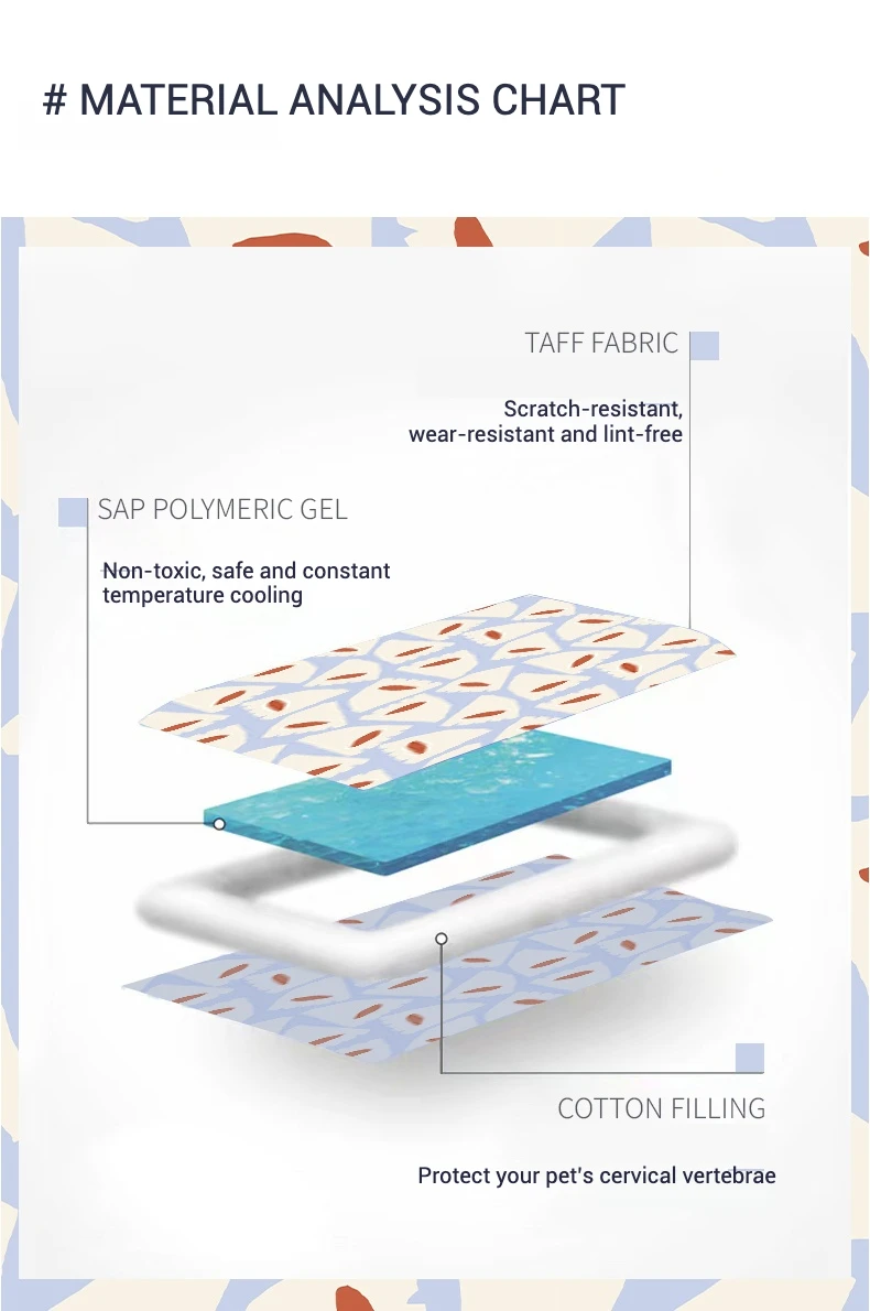 Materiales de primera calidad: Fabricado con tejido de poliéster 30D resistente a los arañazos, al pelaje y relleno con gel polimérico SAP no tóxico para proporcionar un enfriamiento constante y seguro.