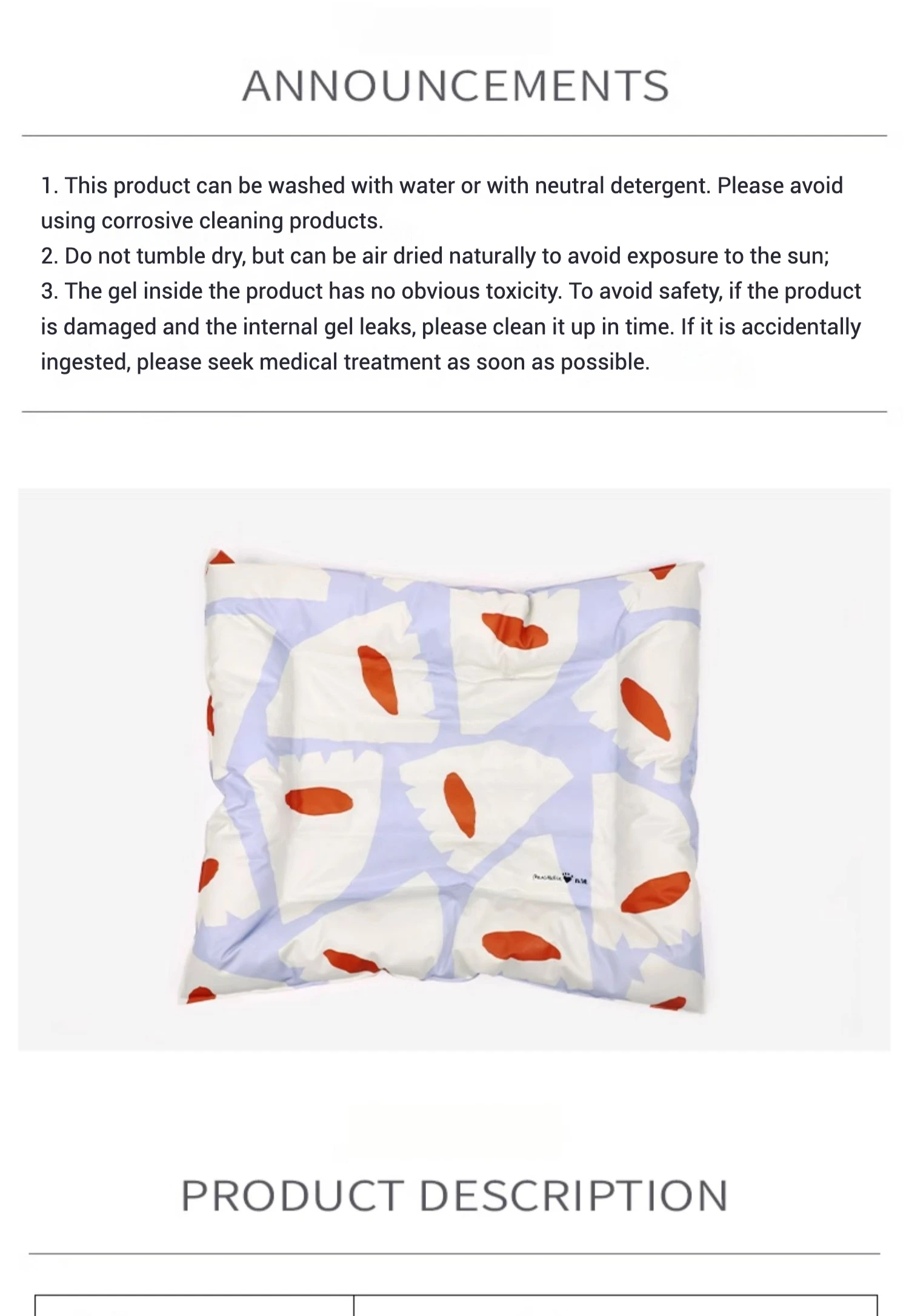 3.El gel dentro del producto no tiene toxicidad evidente.Para evitar la seguridad, si el producto está dañado y el gel interno tiene fugas, límpielo a tiempo.Si se ingiere accidentalmente, busque tratamiento médico lo antes posible.