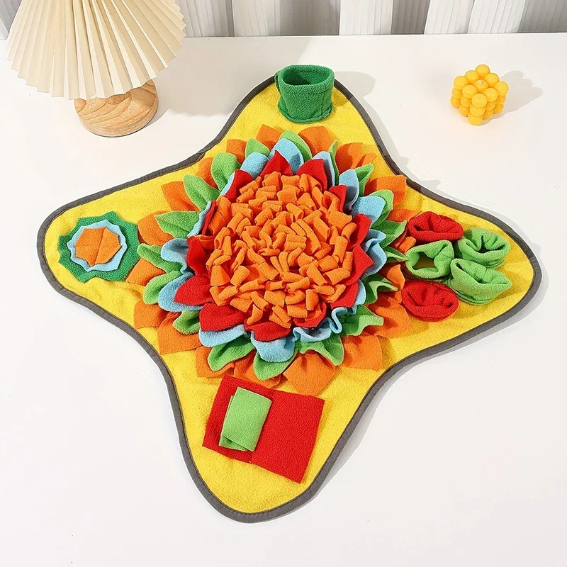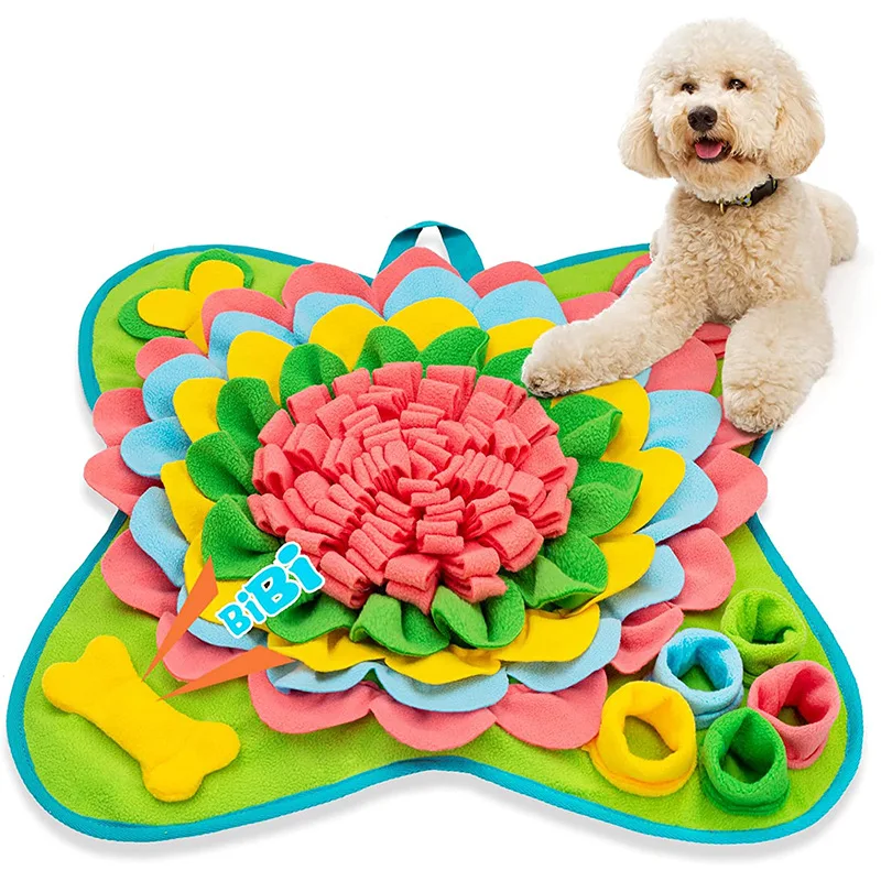 Características: La parte inferior está hecha de tela antideslizante, por lo que no se puede mover fácilmente.Además, la correa de un lado de la alfombra de búsqueda de alimento para perros es fácil de transportar y también se puede colgar en las patas de las mesas u otros artículos, para que el perro no pueda mover la alfombra para olfatear.