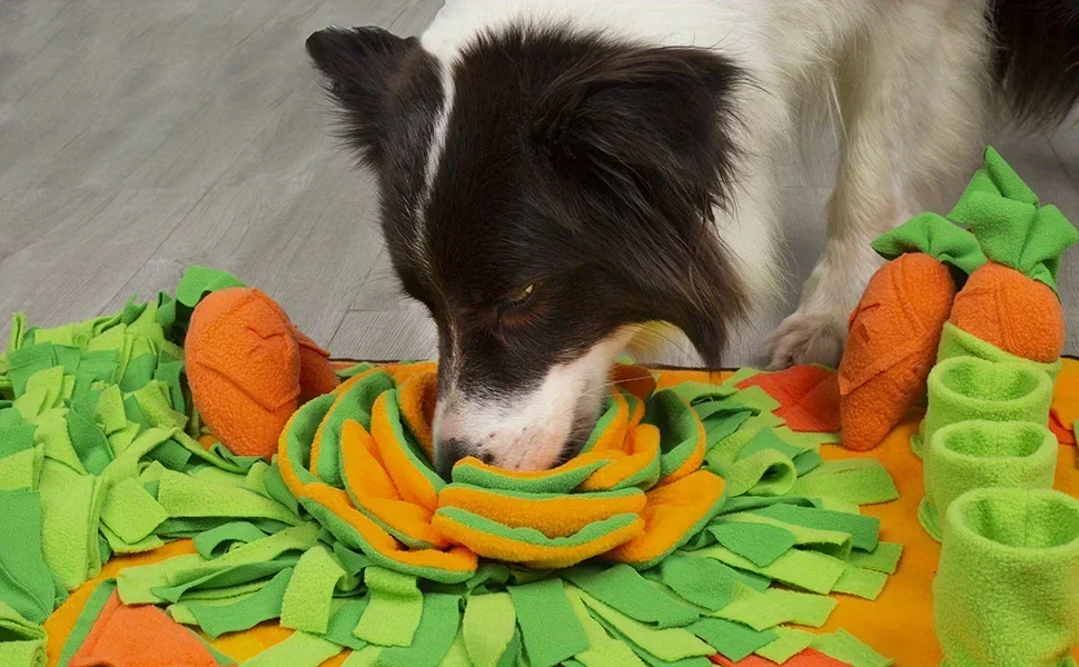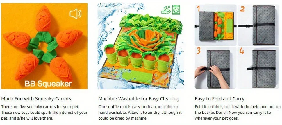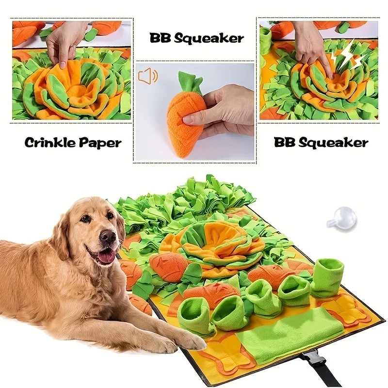 【Seguro y divertido】La alfombrilla para olfatear perros está hecha de poliéster de alta calidad y una construcción duradera que es segura para usted y sus mascotas.Puedes ocultar golosinas en las ricas formas de hierba para animar a tu perro a alimentarse de forma natural.Un chirriador en el centro del pétalo, cinco zanahorias seguidas y varios trozos de papel timbre colocados aleatoriamente despiertan el interés de su perro y le dan mucha diversión.