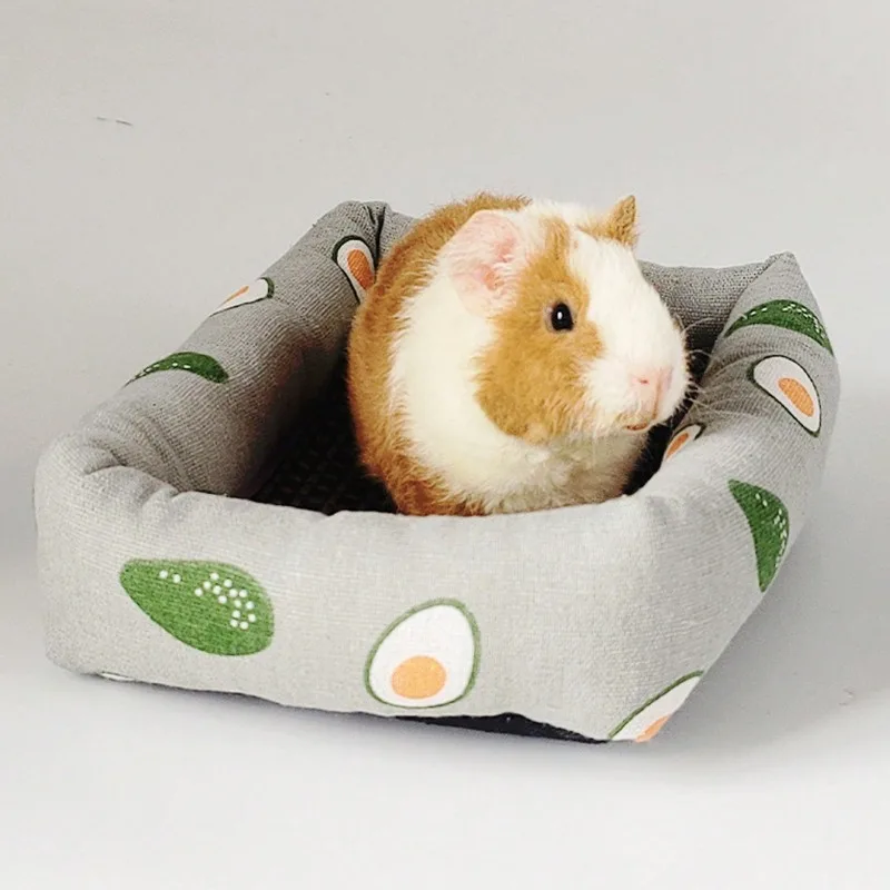 A mis cobayas les encantan estas camas. Vienen con una alfombra de plástico que ayuda a mantener su forma pero también ayuda a mantenerlos frescos en verano. He hecho pequeñas almohadillas para orinar que van dentro. Ayudan a mantener a mis cerditos calentitos en invierno y son fáciles de cambiar y lavar. La cama se lava muy bien en la lavadora (la metí en una funda de almohada con otras cosas para lavar).