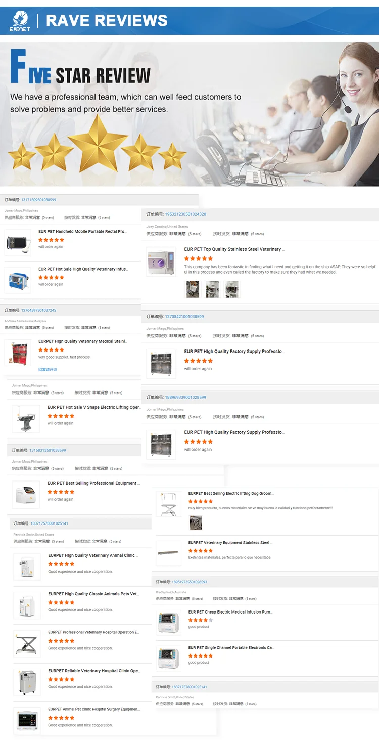P1: ¿Cuál es la ventaja de su empresa?R:Somos exportadores profesionales de equipos veterinarios y productos para el cuidado de mascotas con una rica experiencia de 20 años.Podemos darle sugerencias y soluciones adecuadas.P2: ¿Hay algún descuento?R:Diferentes cantidades tienen diferentes descuentos.P3: ¿Cómo confirmar la calidad del producto antes de realizar el pedido?R:Primero puede comprar 1 muestra.O puede enviarnos sus especificaciones y solicitudes detalladas, personalizaremos los productos de acuerdo con sus solicitudes.P4: ¿Cómo se trata las quejas de calidad?R:En primer lugar, nuestro control de calidad reducirá el problema de calidad a casi cero.Si hay un problema de calidad real causado por nosotros, le enviaremos accesorios gratuitos para su reemplazo o le reembolsaremos su pérdida sobre la base de proporcionar el video o las fotos;Si hay algún daño causado por el transportista, ayúdenos a tomar un video o una foto la primera vez en el puerto antes de aceptarlo.Hablaremos directamente con el transportista para resolverlo.P5: ¿Cuál es su garantía?R:La mayoría de nuestros productos tienen una garantía gratuita de 1 año o 2 años y un mantenimiento de por vida.P6: ¿Qué tal el plazo de entrega?R: Plazo de entrega: generalmente entre 7 y 25 días hábiles después de confirmado el pago.P7: ¿Cómo iniciar pedidos o realizar pagos?R:La factura proforma se enviará primero después de confirmar su pedido, adjuntará nuestra información bancaria. Pago por T/T, tarjeta de crédito, Western Union o Paypal, etc. P8: ¿Cómo contactarnos? R: Puede chatear con nosotros a través de Trademanager, mensajes en línea, etc. Puede elegir los productos que le interesan y enviar una consulta, marcar nuestro teléfono directamente o enviarnos un correo electrónico directamente, recibirá nuestra respuesta dentro de las 8 horas.