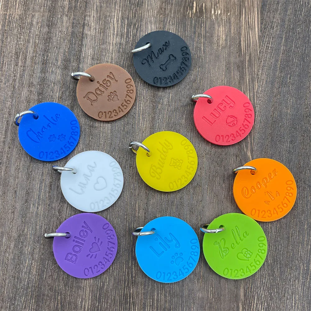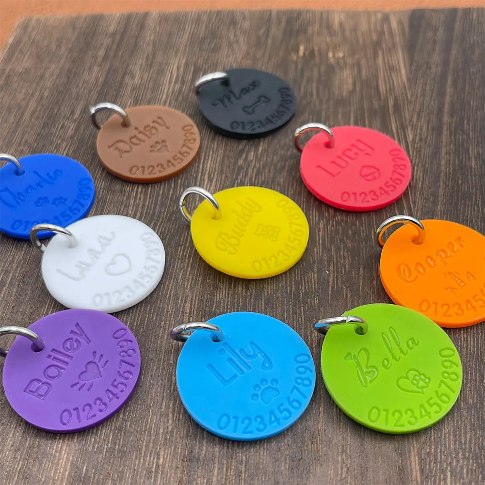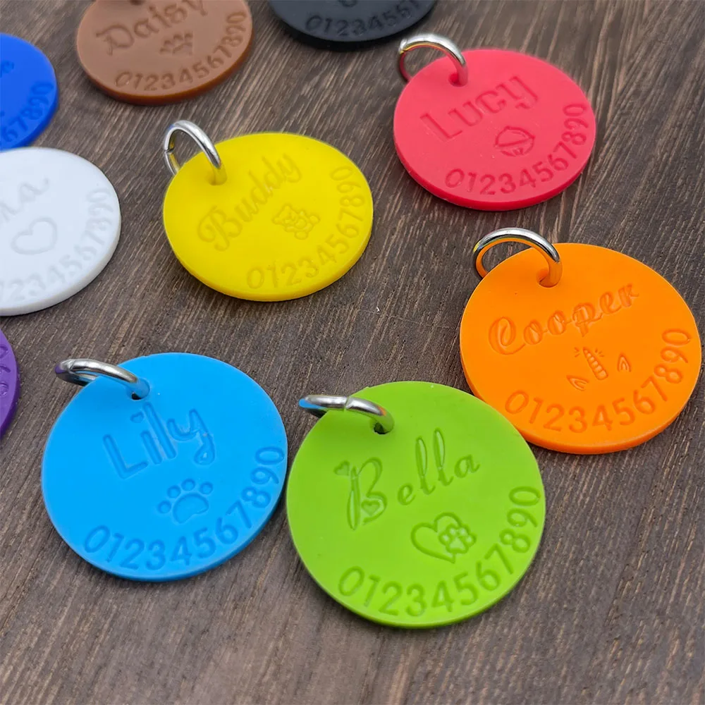 INCONTROLABLE. Información en relieve COMPLETAMENTE INVISIBLE en silicona. La misma etiqueta que se supone que es para un perro de la raza Chihuahua pequeño es una apuesta en el 10: ligera, colorida, de tamaño perfecto, pero las letras y números en relieve no permiten leer la información. Completamente inútil.