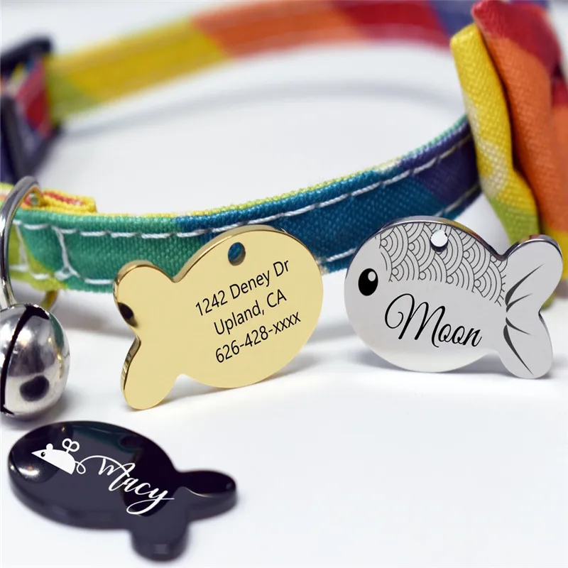 Etiqueta de identificación de gato grabada personalizada gratis, placa de identificación de gatos con forma de pez bonito, etiquetas antipérdida para mascotas, Collar para gatos, accesorios para mascotas
