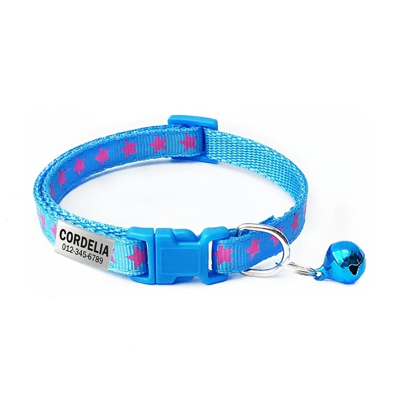 Etiqueta de identificación grabada con nombre de mascota y número de teléfono con collar de perro de nailon con patrón de estrella ajustable para gatitos y cachorros