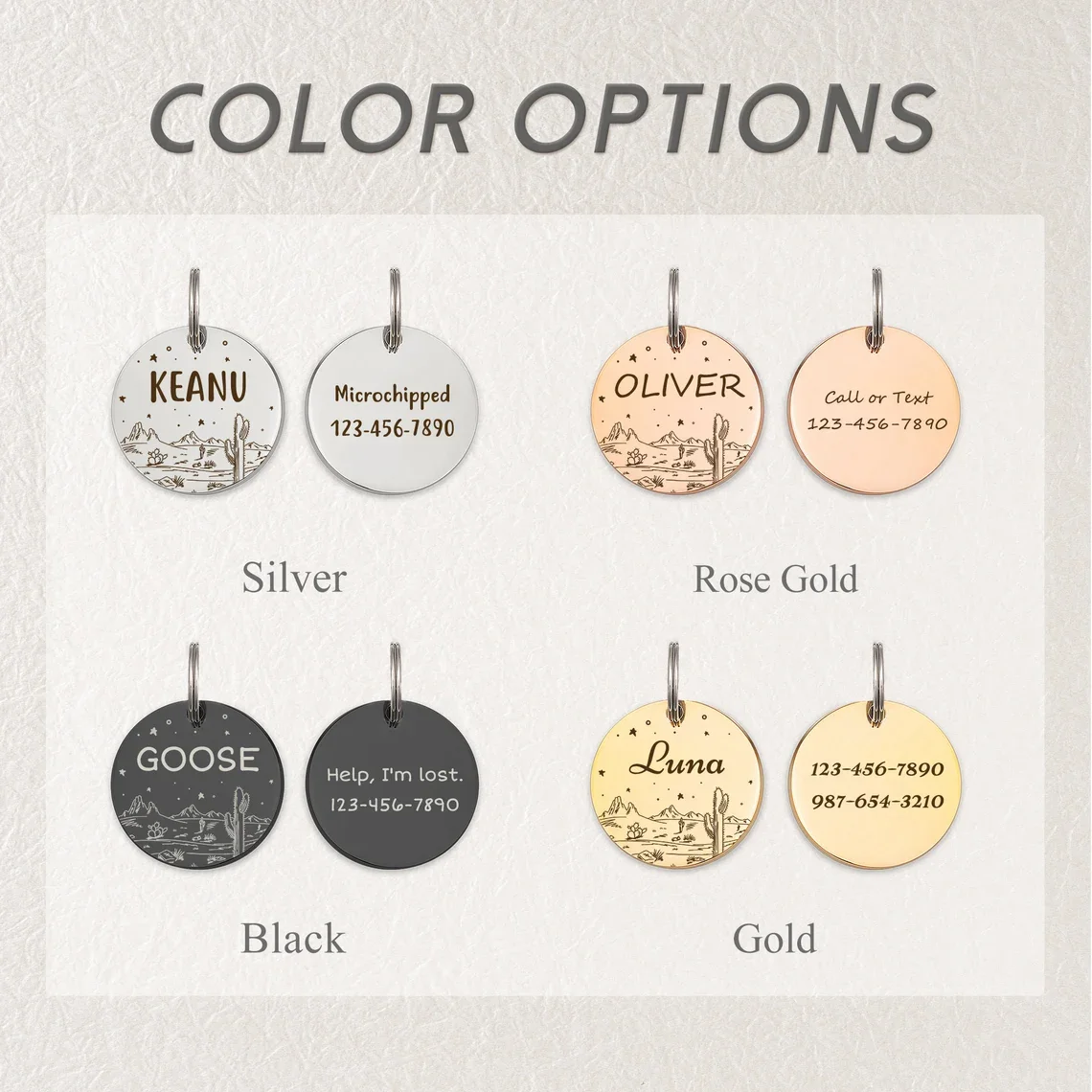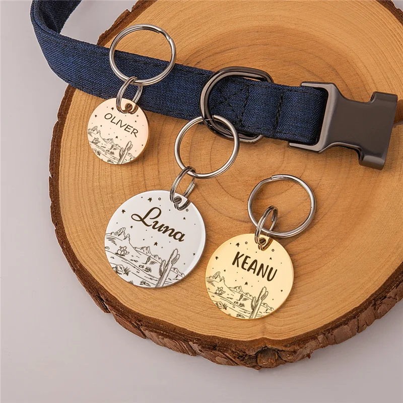 Etiqueta de identificación personalizada para perros y gatos, estrellas del desierto con lindo cactus grabado en la parte delantera y trasera para collar de mascotas personalizado, abalorio de Metal antipérdida
