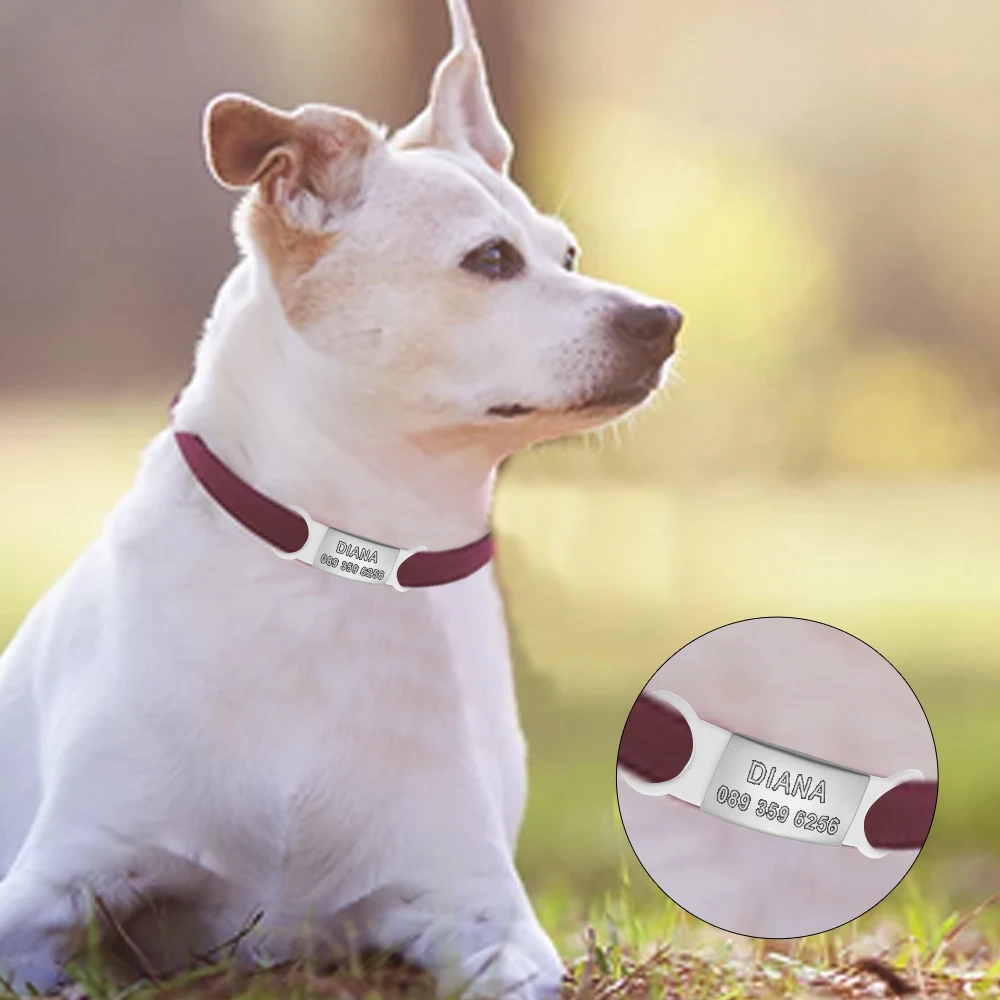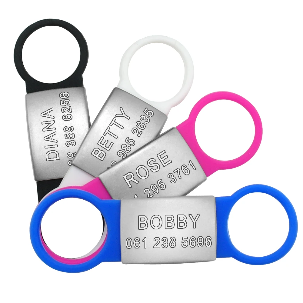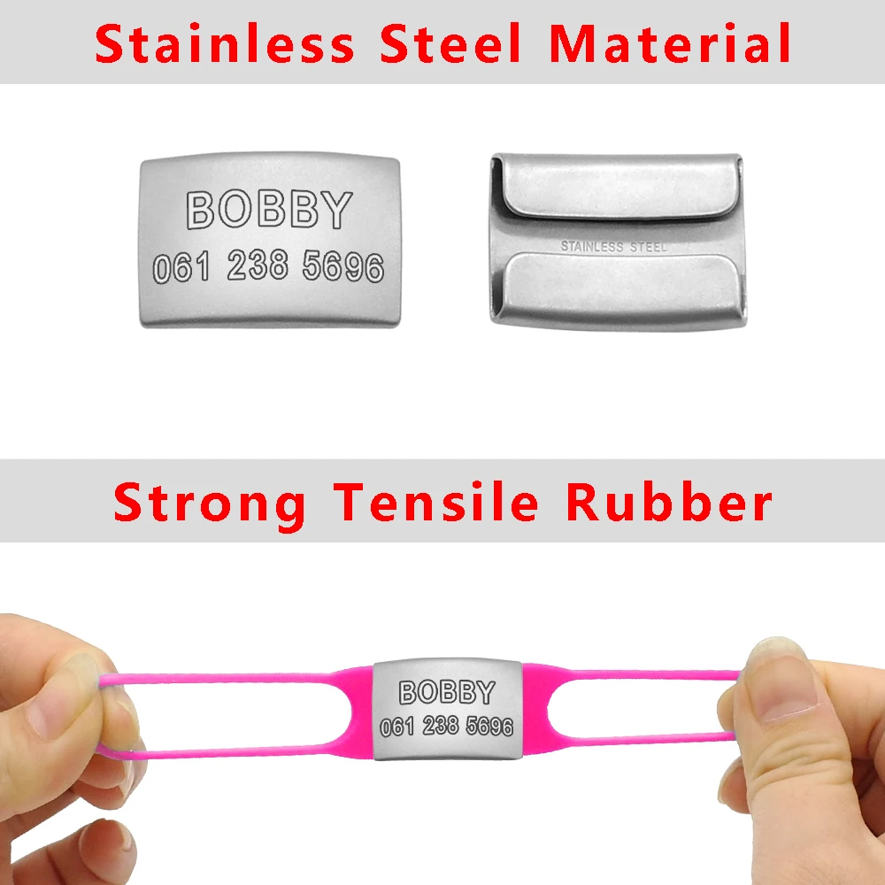- Material: la etiqueta de acero inoxidable no se oxida. Hebilla de goma súper elástica, adecuada para collares de diferentes tamaños.