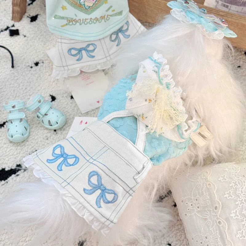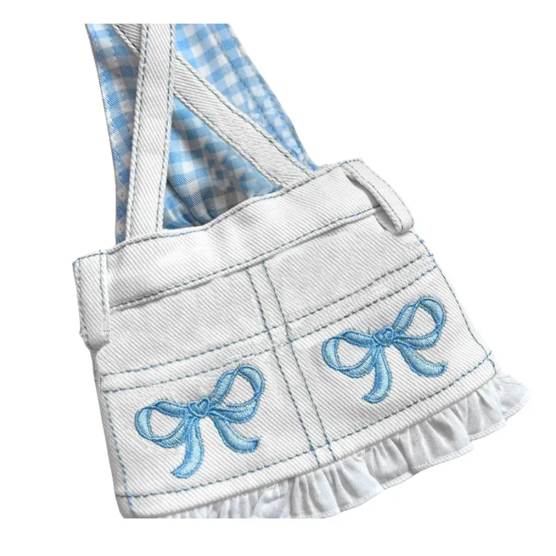 Falda con tirantes de vaquero bordada con agradable arco para otoño/invierno, vestido sencillo de peluche para perros pequeños, ropa para cachorros