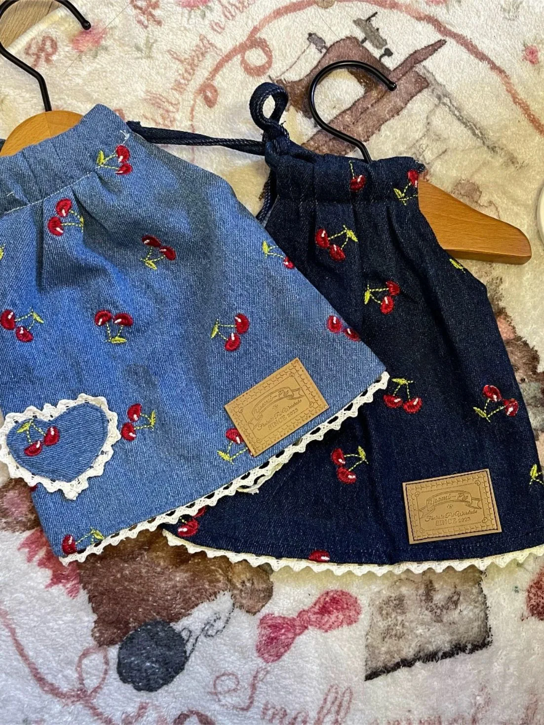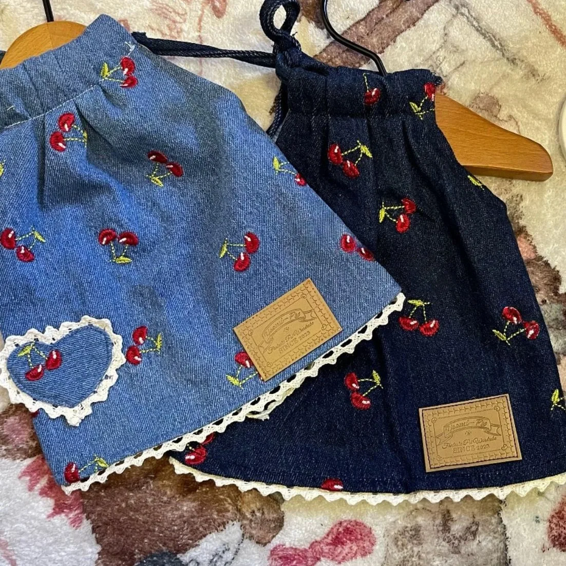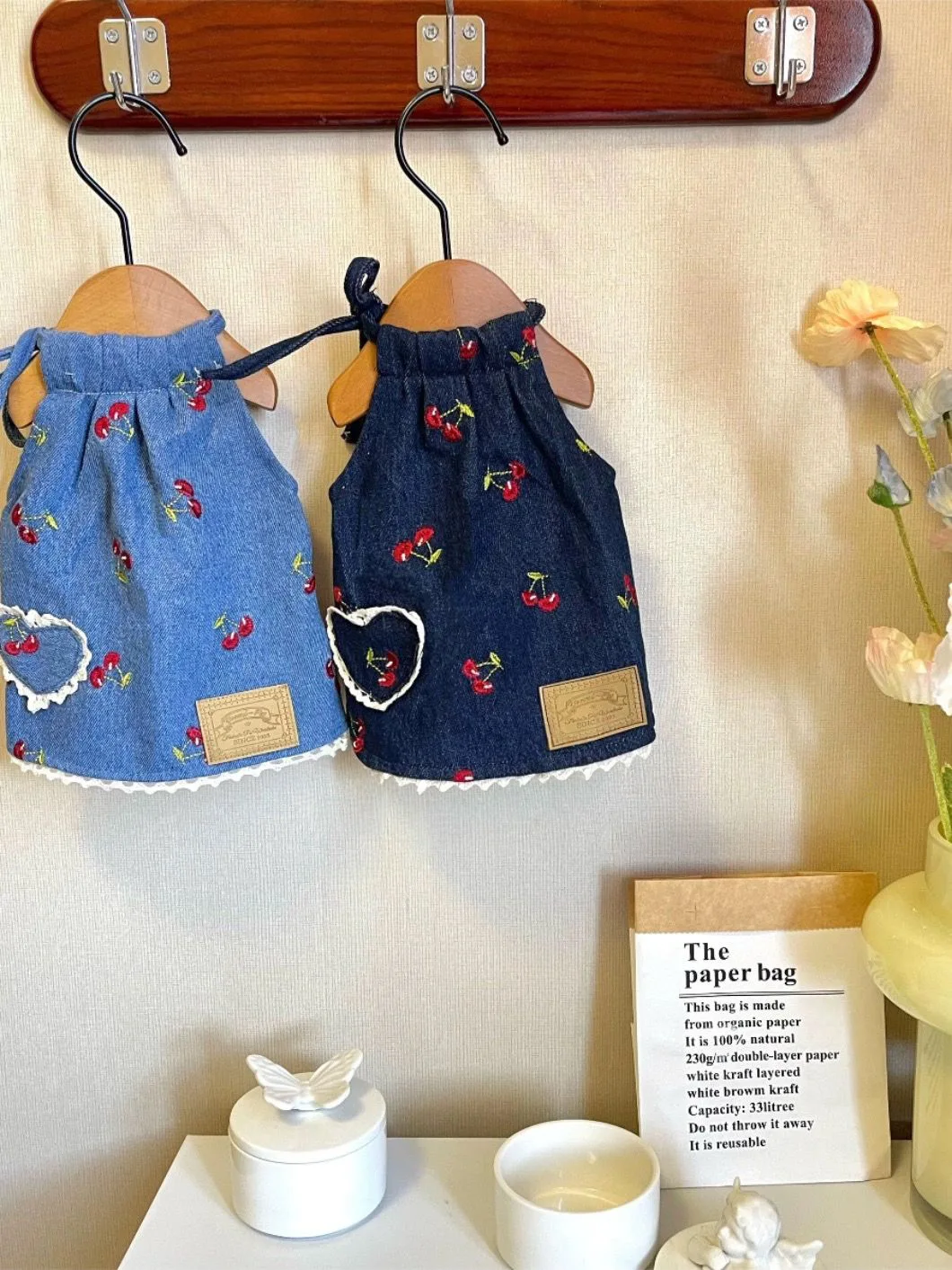 Falda vaquera con tirantes de cereza para mascotas, conjunto de ropa para pareja de Marcus, Yorkshire, chaleco para perros y gatos, ropa de diseñador para perros
