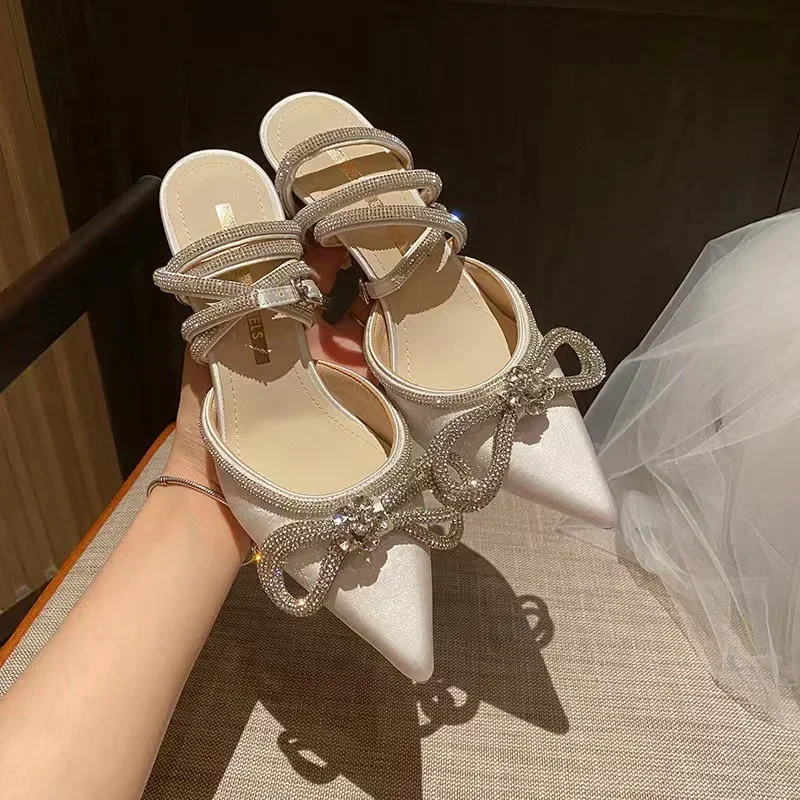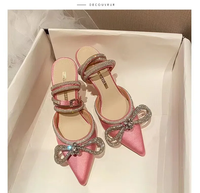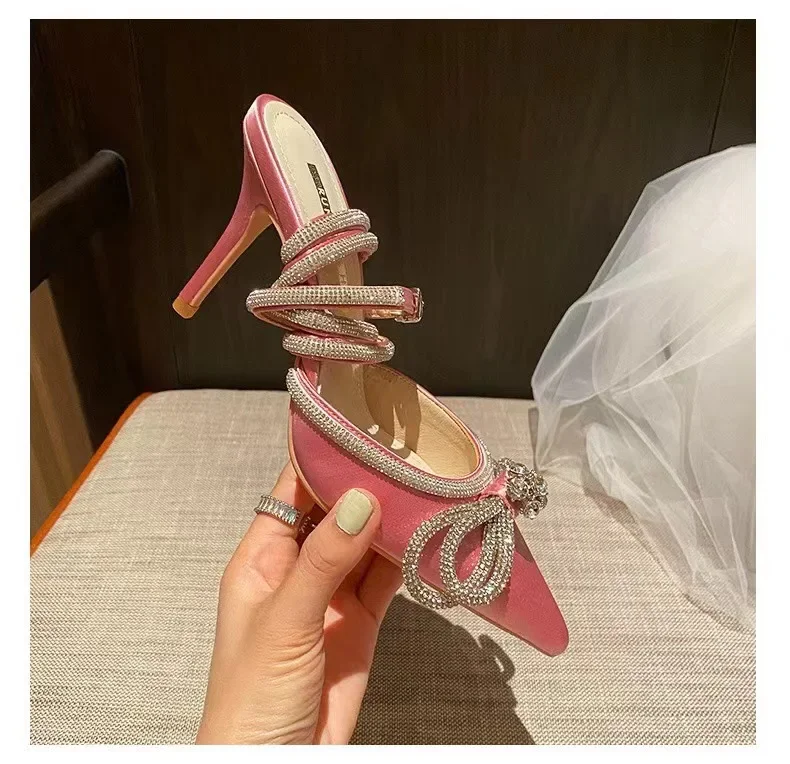 Fashion Style Glitter Rhinestones Women Pumps Crystal Bow 8 Cm Summer Lady Shoes Genuine Leather High Heels Party Prom Shoes