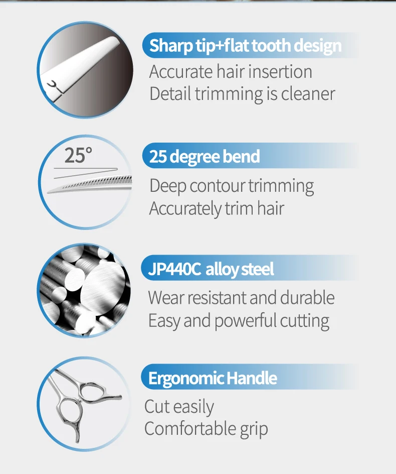Fenice Master Series Tijeras para perros Tijeras mágicas 5D Acero JP440C Tijeras para peluquerías curvadas Chunker Tijeras para mascotas 70-75% Velocidad tijeras peluquería canina