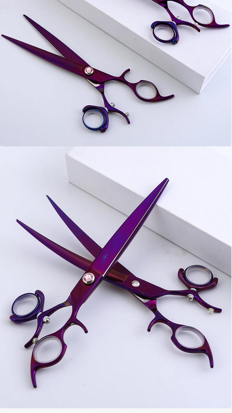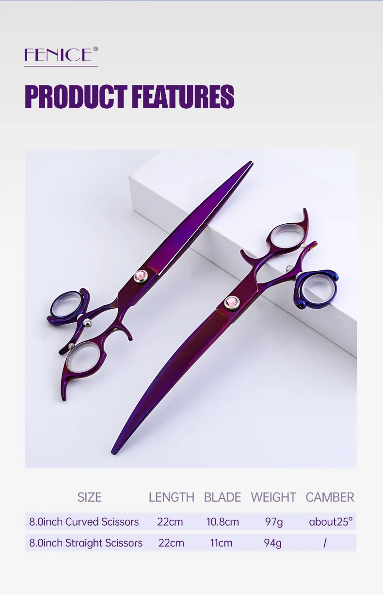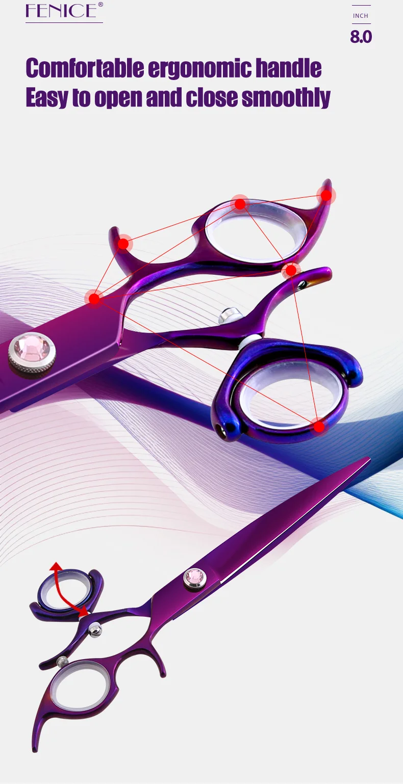 Tijeras profesionales para perros Fenice, mango de 3 agujeros de 8 pulgadas, giratorios de 360 grados, tijeras de aseo para mascotas curvas rectas moradas JP440C