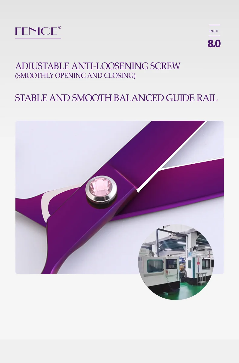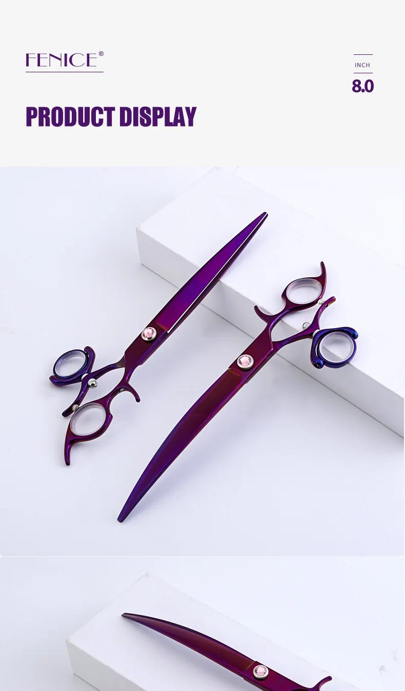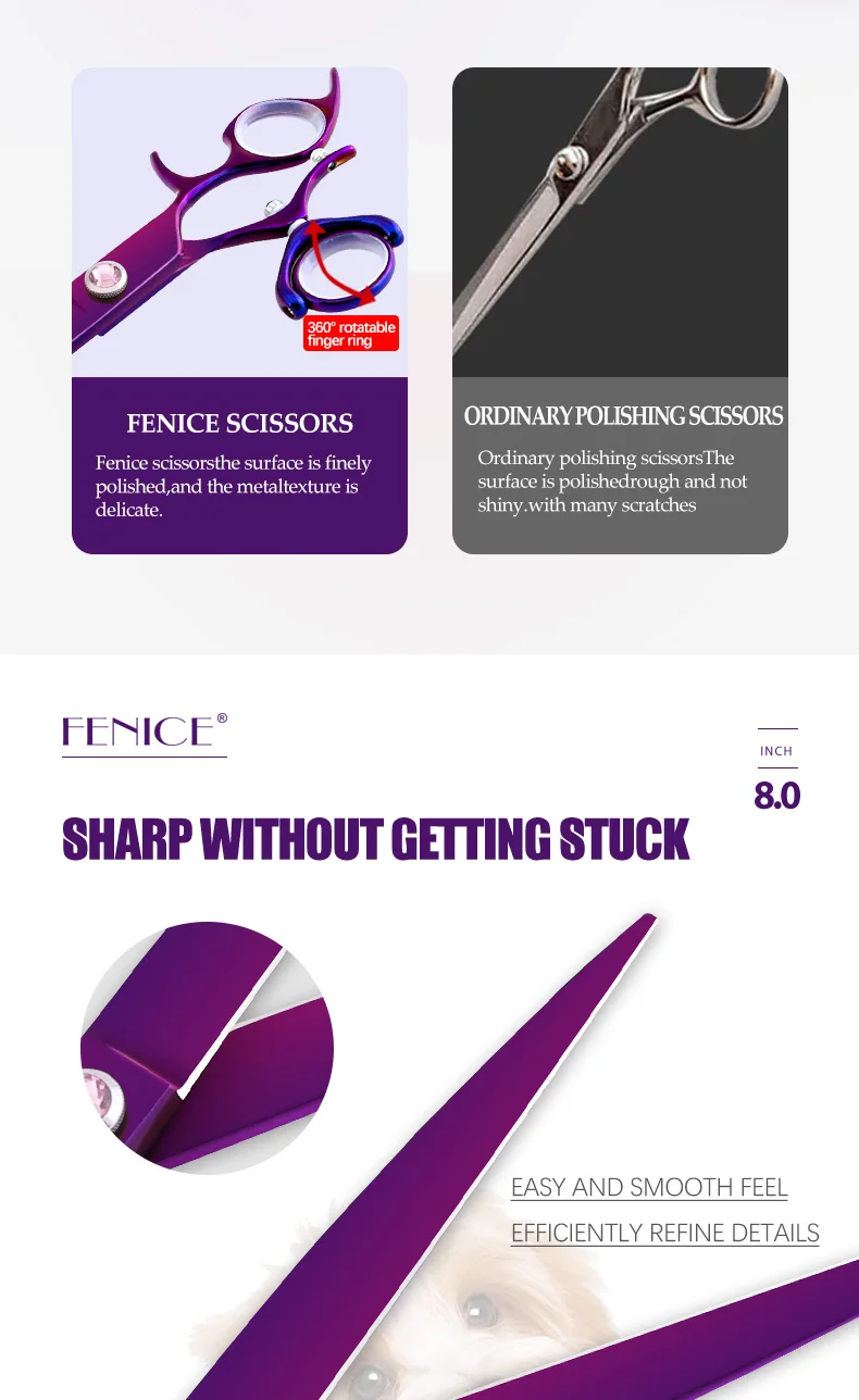 Tijeras profesionales para perros Fenice, mango de 3 agujeros de 8 pulgadas, giratorios de 360 grados, tijeras de aseo para mascotas curvas rectas moradas JP440C