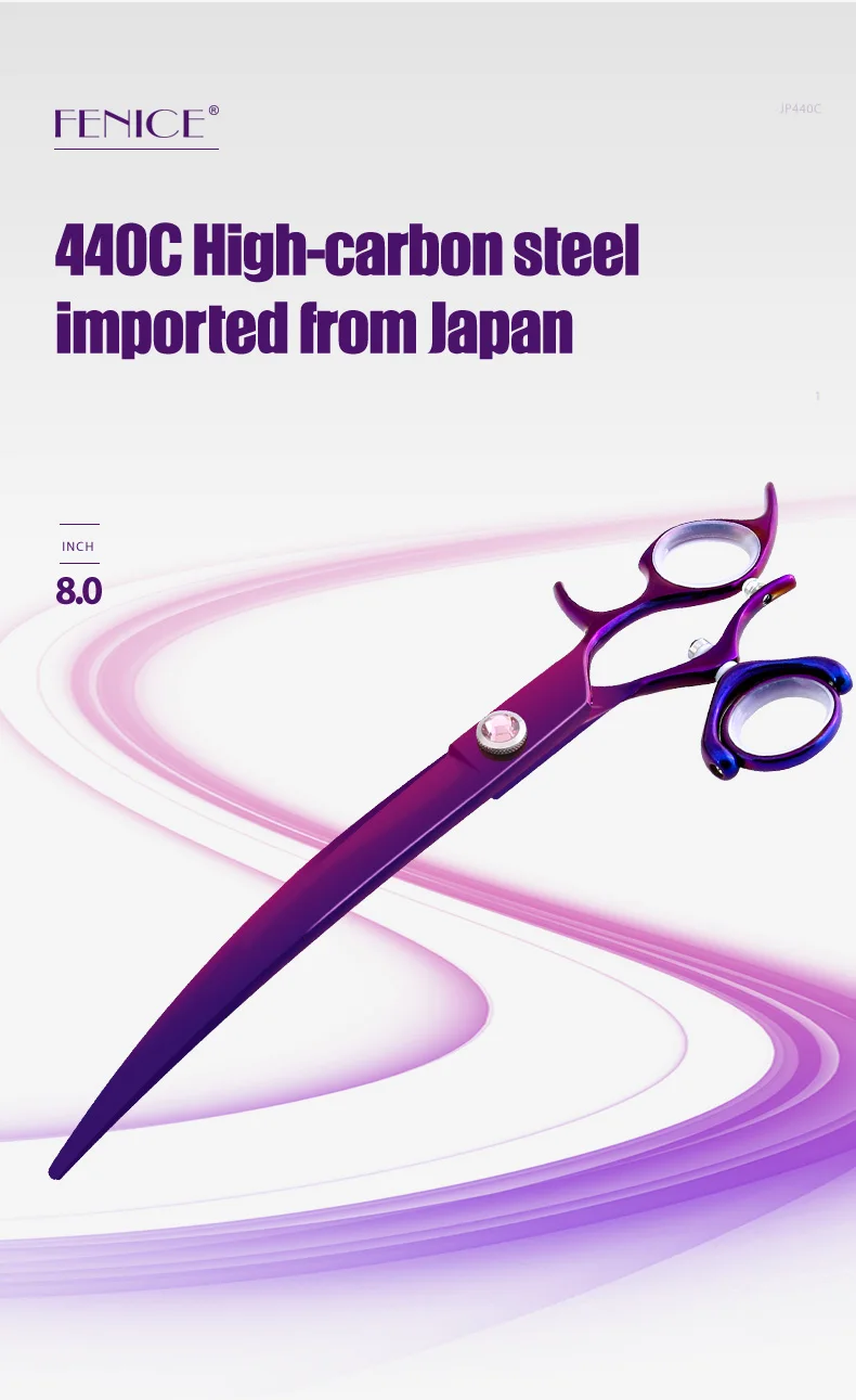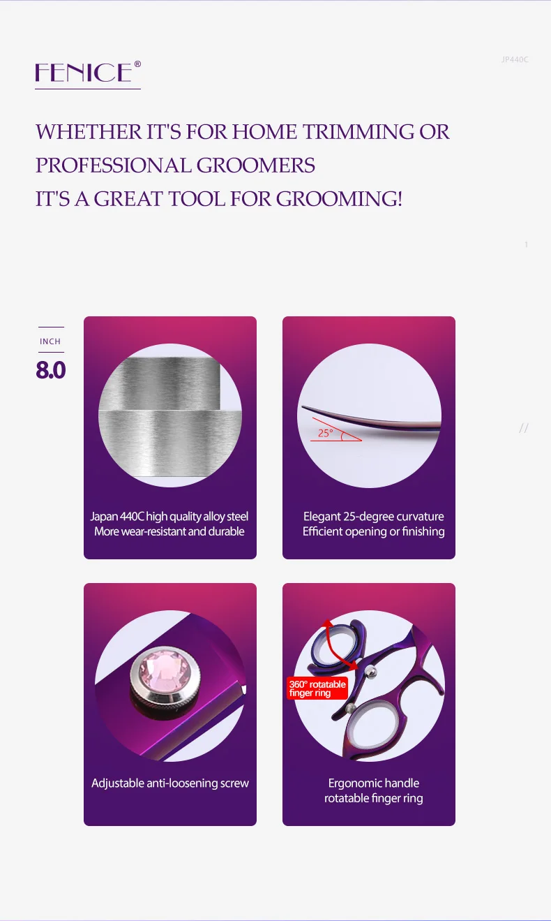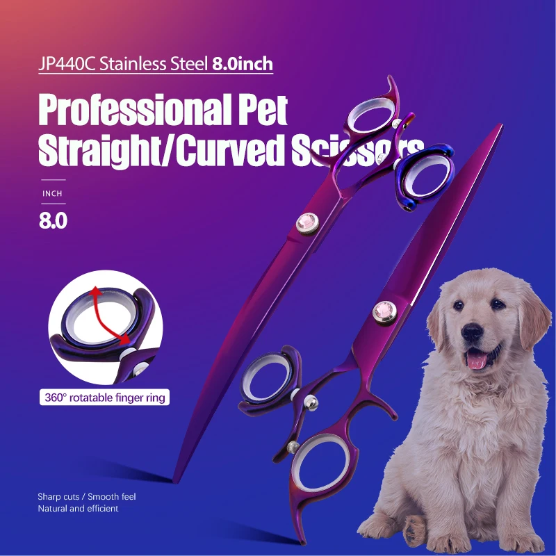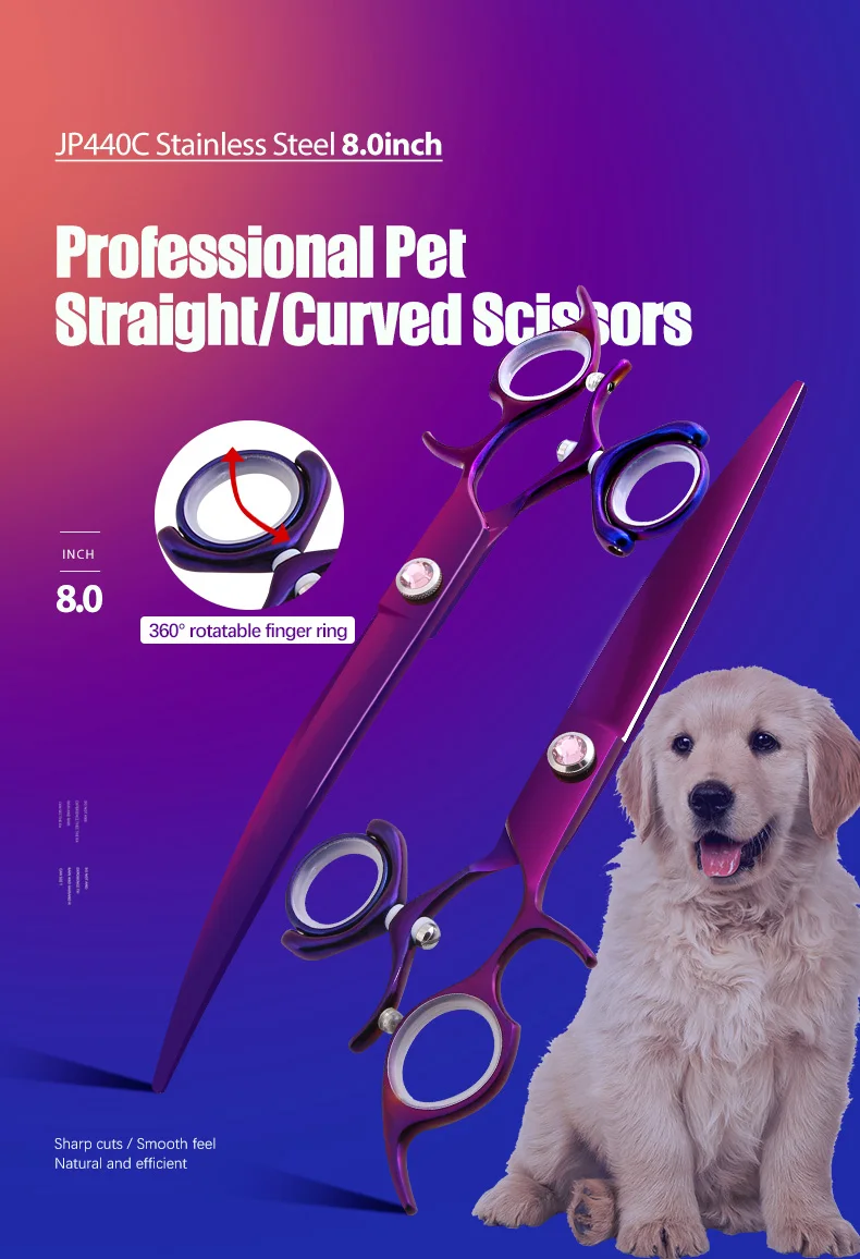 Fenice-Tijeras profesionales para perros JP440C, 8 pulgadas, mango giratorio de 360 grados, giratorias, color morado, rectas, curvadas, para aseo de mascotas