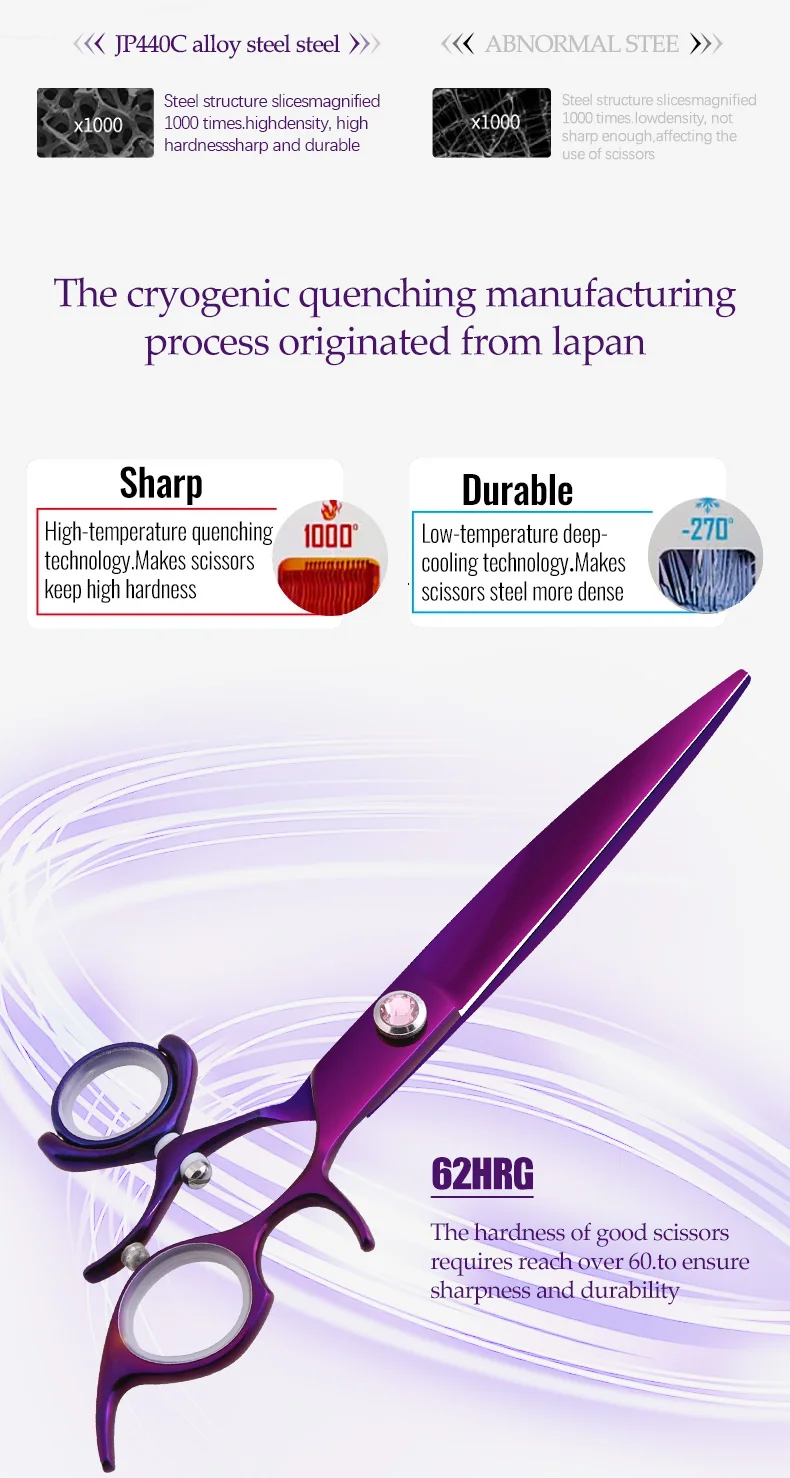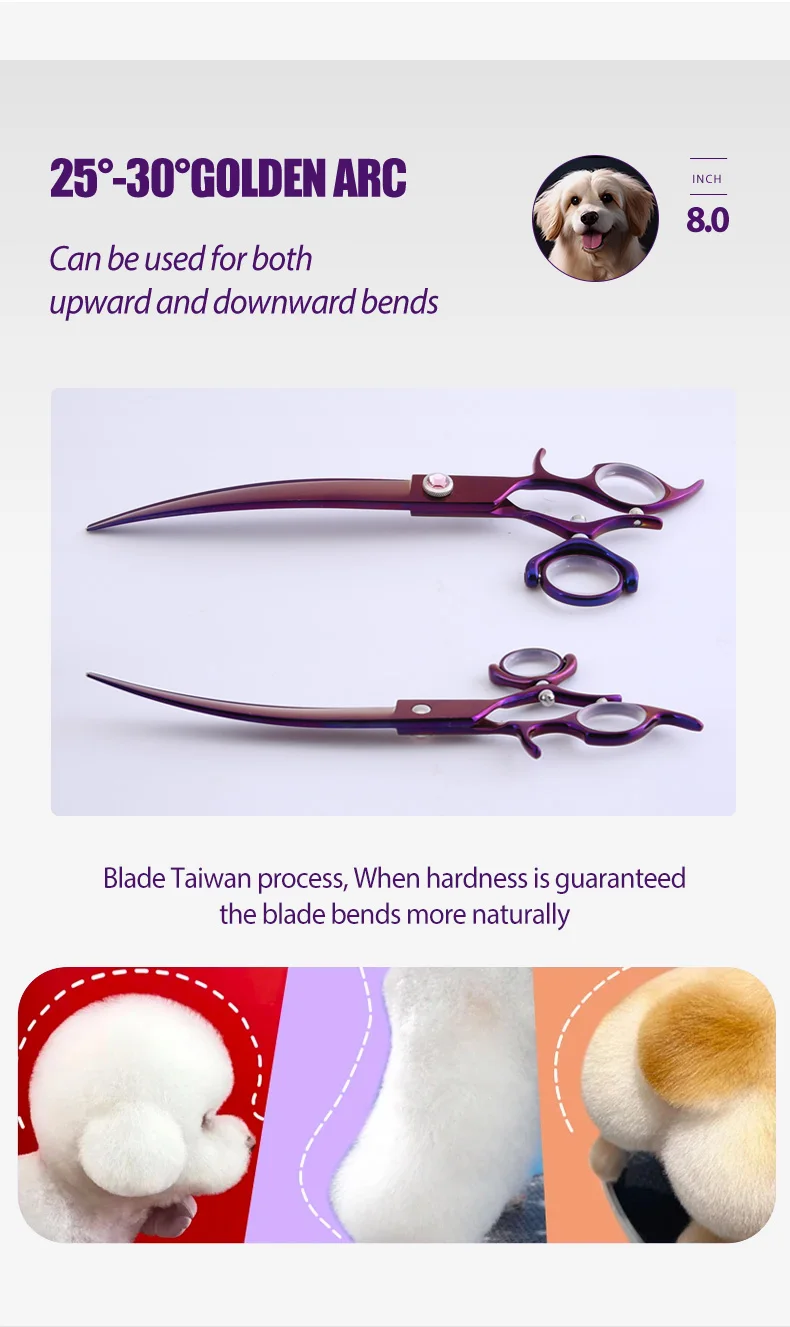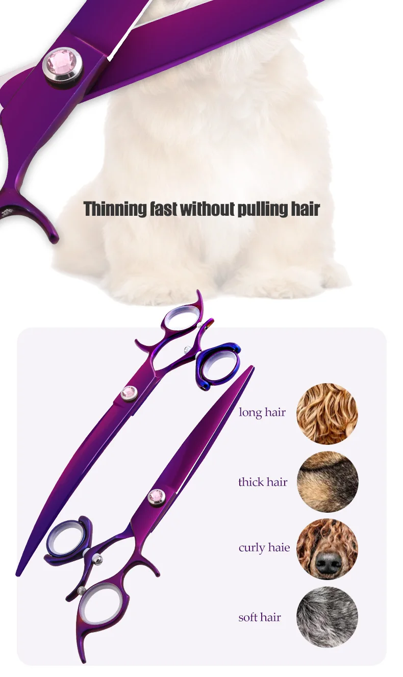 Fenice-Tijeras profesionales para perros JP440C, 8 pulgadas, mango giratorio de 360 grados, giratorias, color morado, rectas, curvadas, para aseo de mascotas