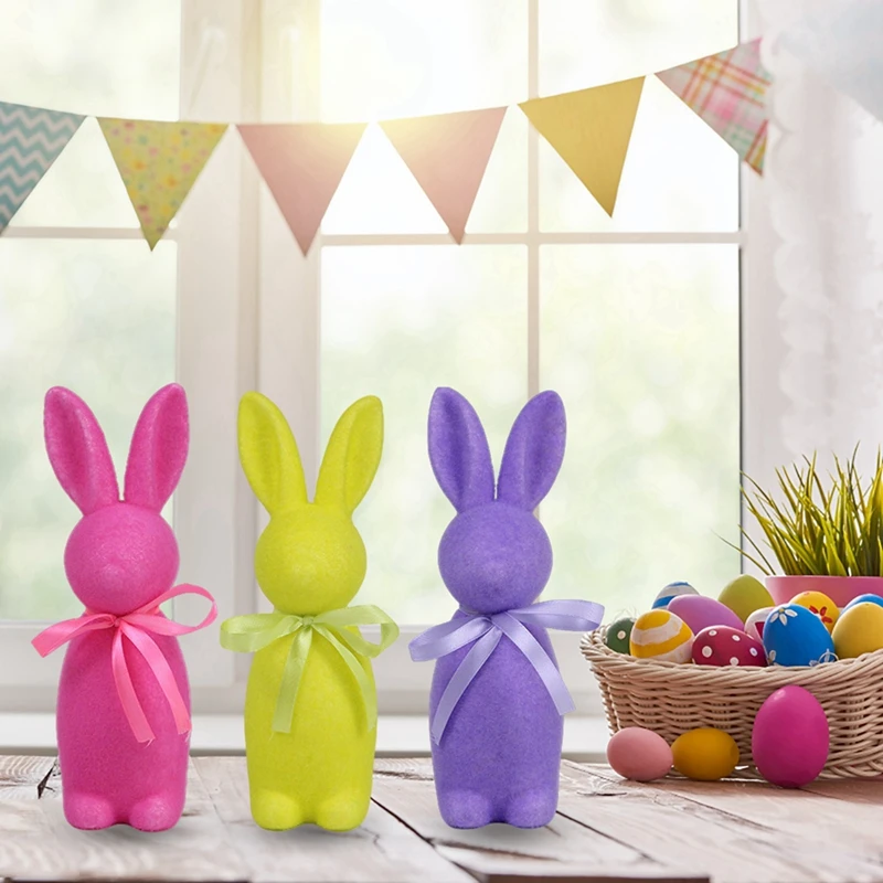 【Múltiples opciones】Las figuras de conejo flocadas están disponibles en 3 colores, azul/rosa/amarillo, aportando vitalidad de la primavera a tu hogar.