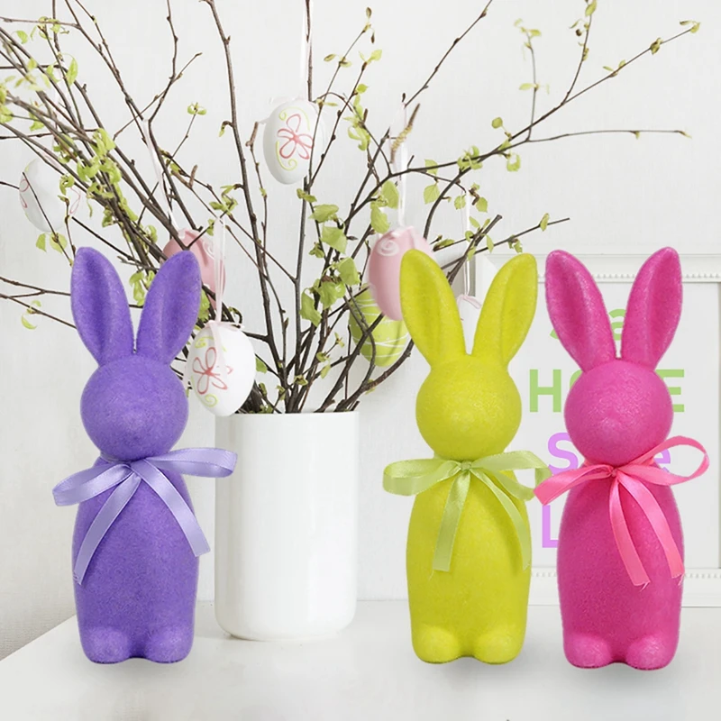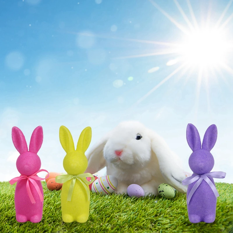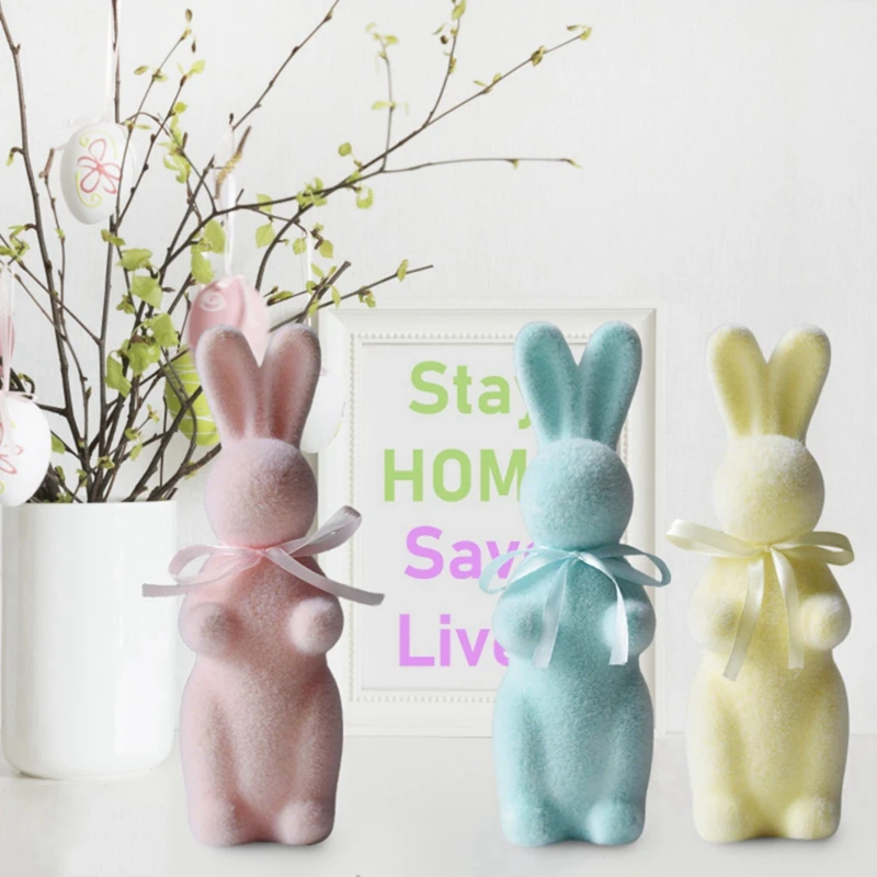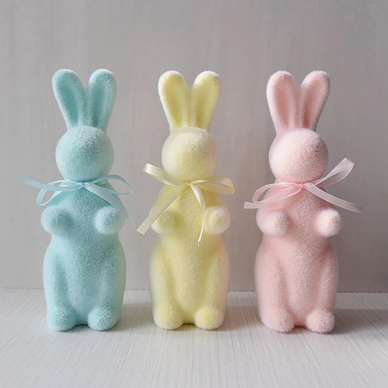 【Aspecto lindo】 Figuras de conejo de pie en 3D, con lazo, color sólido, superficie flocada, apariencia vívida, muy linda y encantadora.