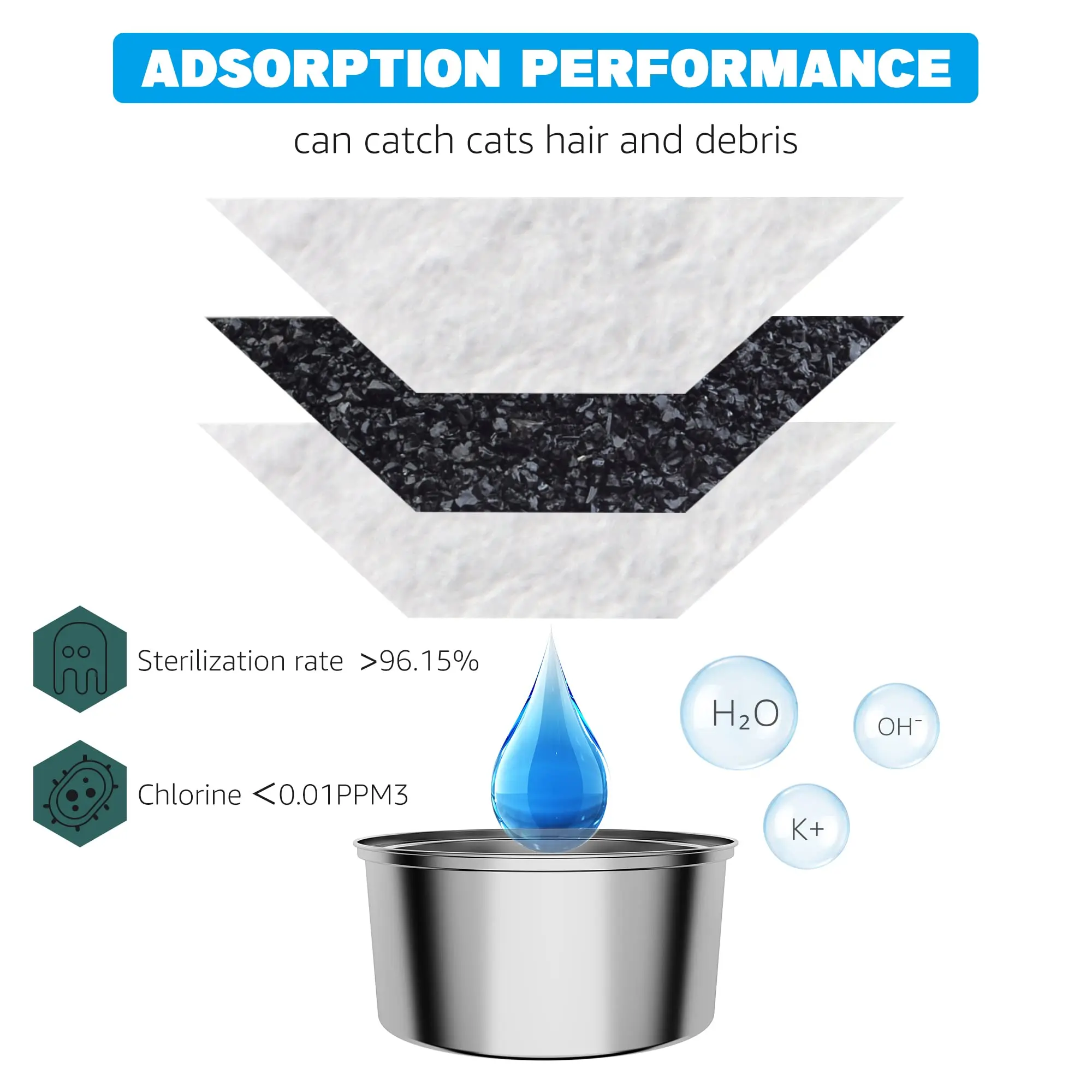 Sistema de filtración circulante de tres capas: este reemplazo de filtro de fuente de agua contiene carbón activado para gatos, que junto con la tela no tejida forma un sistema de filtración circulante de cuatro CAPAS. Filtra eficazmente el pelo de las mascotas, los residuos de alimentos, absorbe olores y suaviza el agua, proporcionando a su mascota agua potable fresca y saludable.